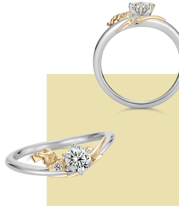 ピカチュウがメレダイヤモンドを抱えている姿が愛らしい。リングはダイヤモンドを留める爪のうち1本がでんきのモチーフになっている遊び心のあるデザインです。
