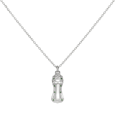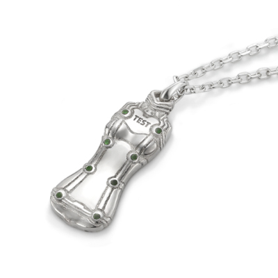 映画「ヱヴァンゲリヲン新劇場版」で、EVA3号機搭乗実験の際に式波・アスカ・ラングレーが着用したテストプラグスーツをモチーフにしたネックレス。 金属の厚みに細やかな強弱をつけることで、着用しているかのようなボディラインを表現。 ボディラインにデザインされた緑の球体は、職人の手作業により色づけられた日本の伝統工芸「七宝焼き」によるもので、ジュエリーブランドならではの、繊細で深みのあるアイテムに仕上げました。 ネックレスの留め具には、インターフェイスのモチーフがさり気なくデザインされた遊び心溢れるデザイン。