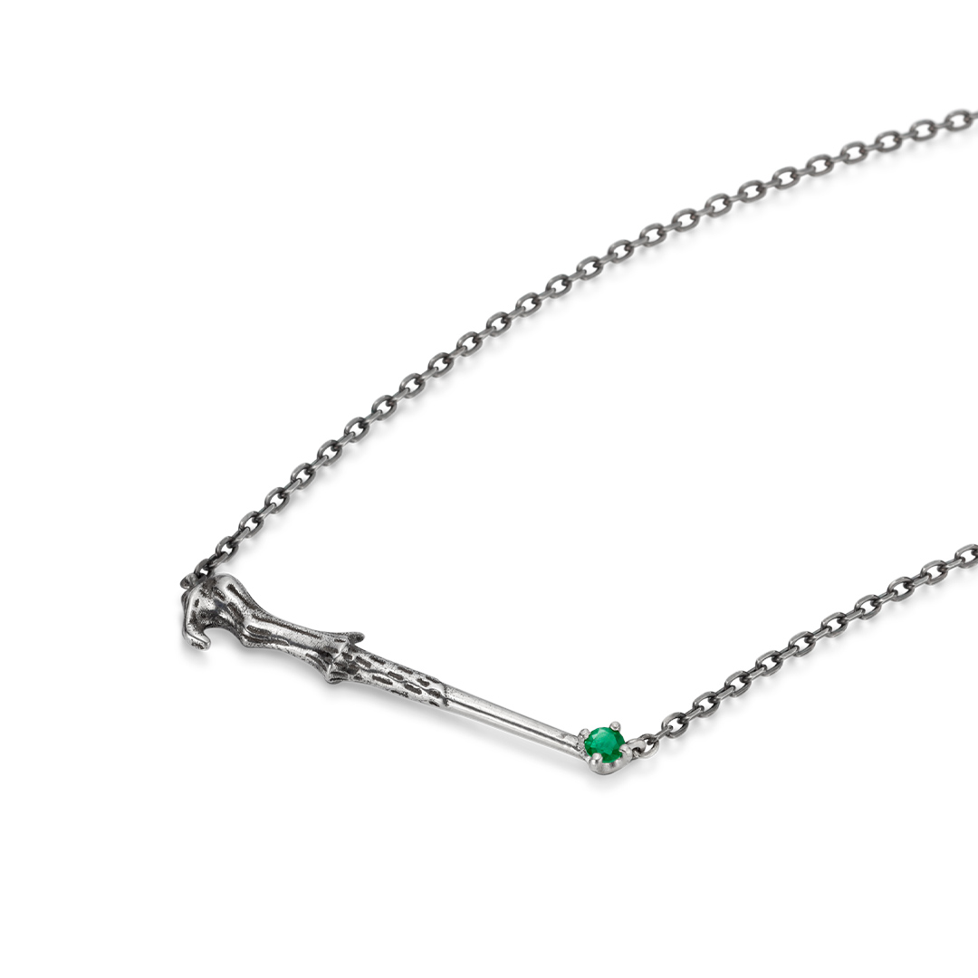 ヴォルデモート卿の持つ杖をイメージしたネックレス。 デイリーに身に着けやすい小ぶりのサイズながらも、360度立体的に作りこまれた繊細な造形が目を引きます。 先端には、杖から放たれる緑の閃光をイメージした宝石・エメラルドを留めて。