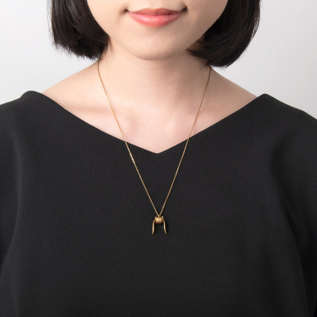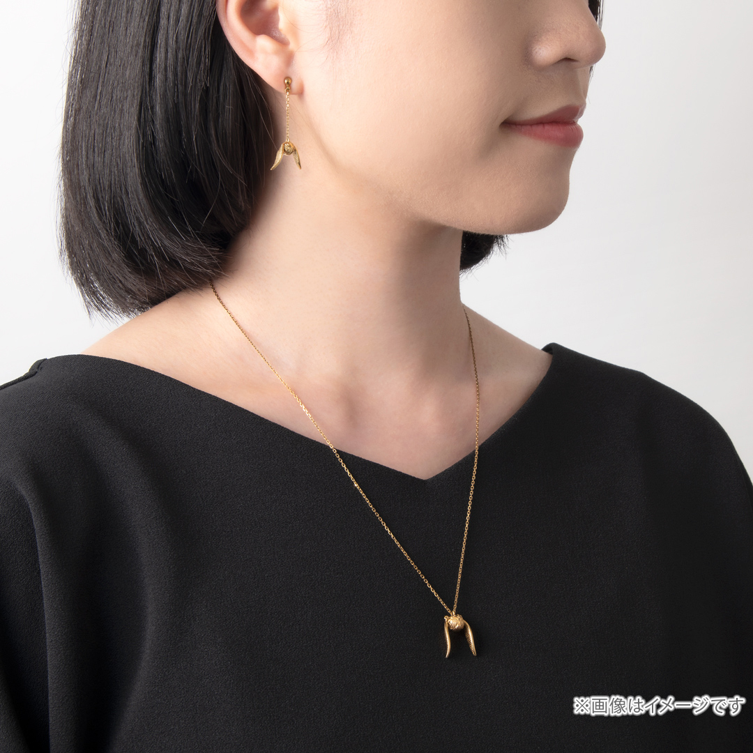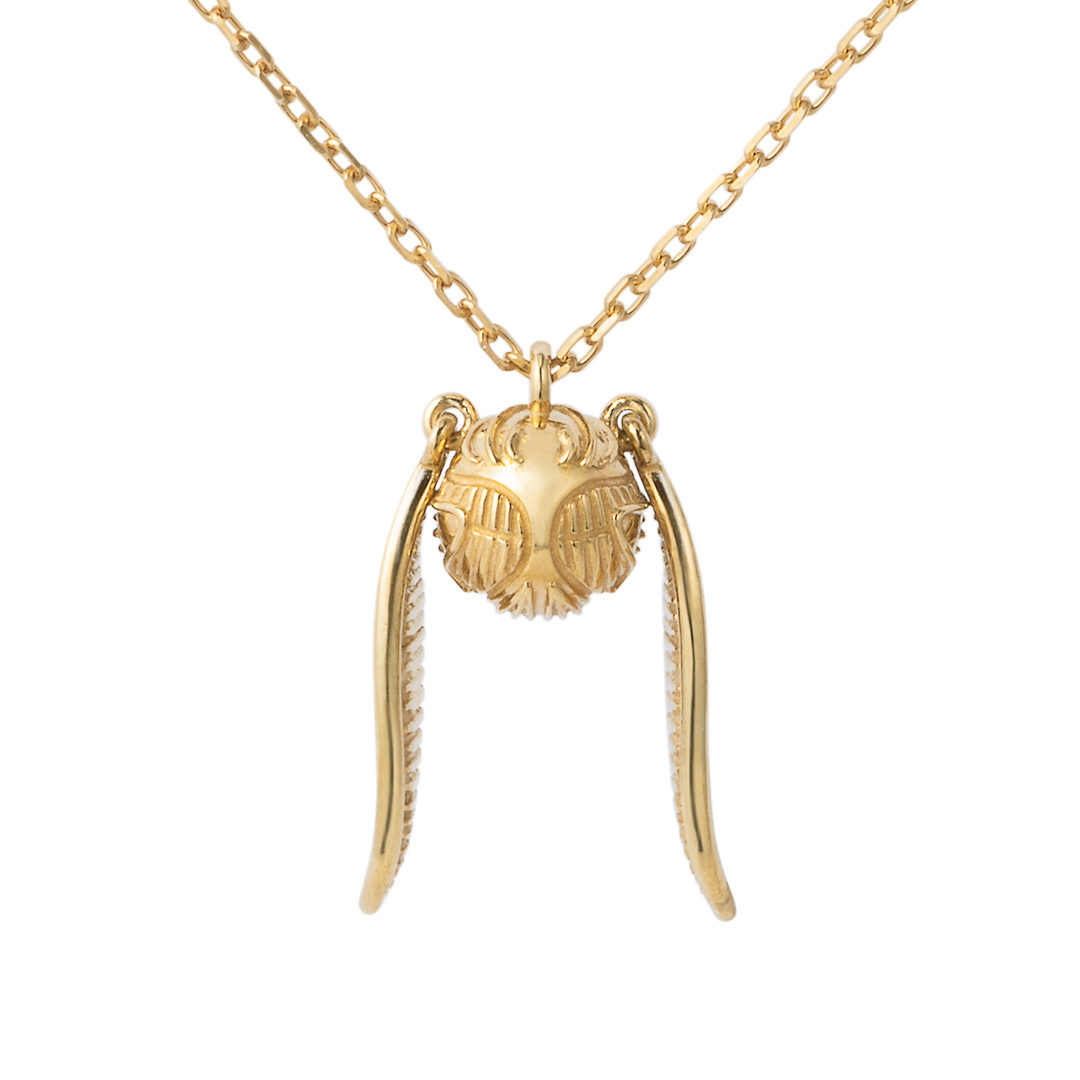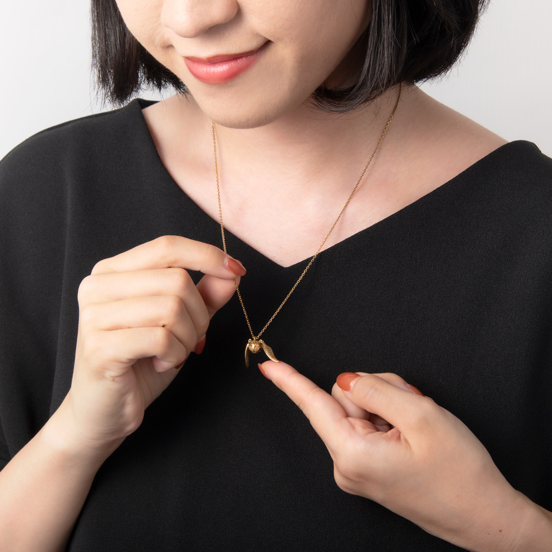 「羽で飛ぶクィディッチのボール。捕らえたシーカーのチームは150点を得ることができる」“金のスニッチ”をモチーフとしたネックレス。