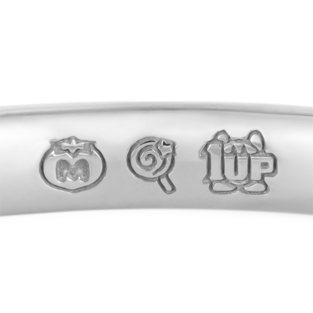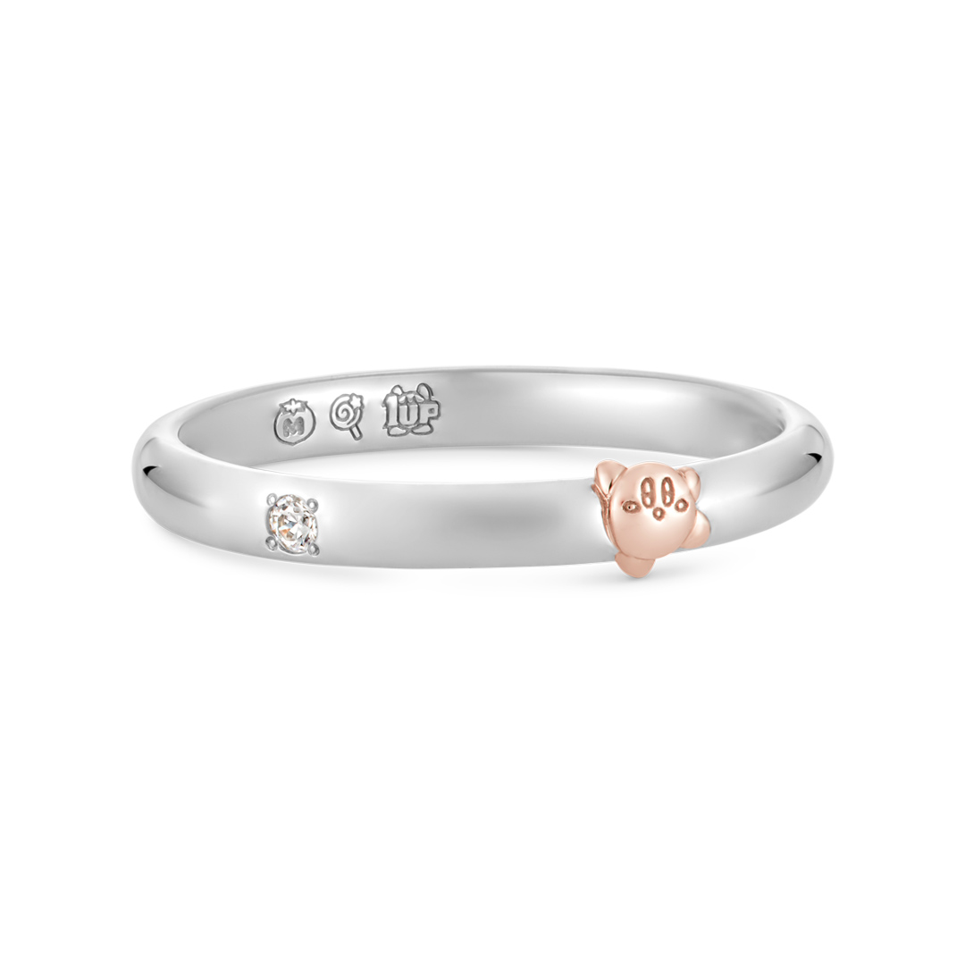 シンプルなストレートラインのリングの内側にマキシムトマト、キャンディー、1UPのマークを刻印。表面に永遠の愛を象徴するダイヤモンドを留めました。パワーアップアイテムでさらに元気になったカービィが