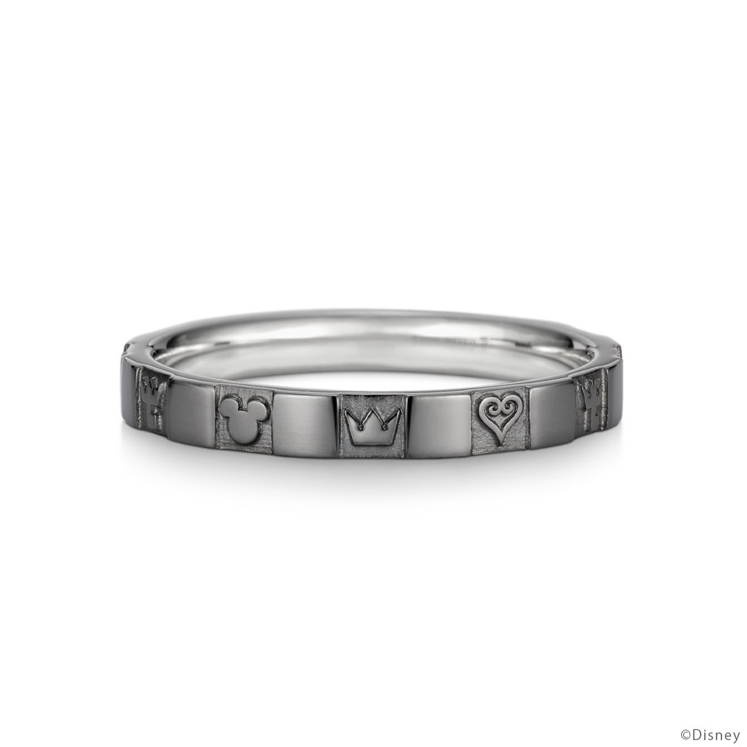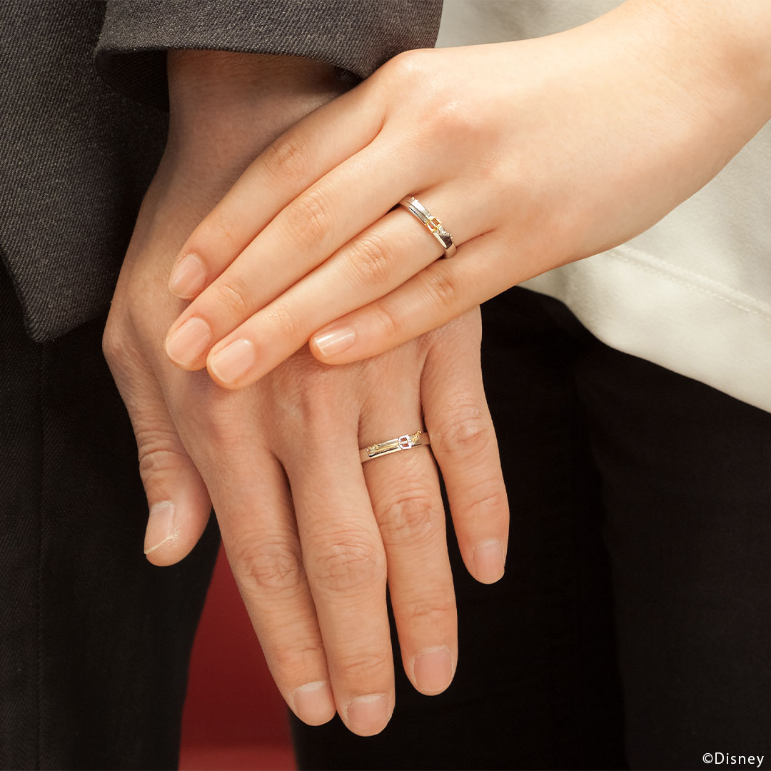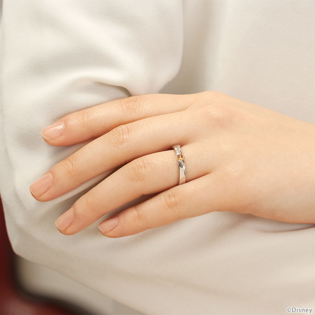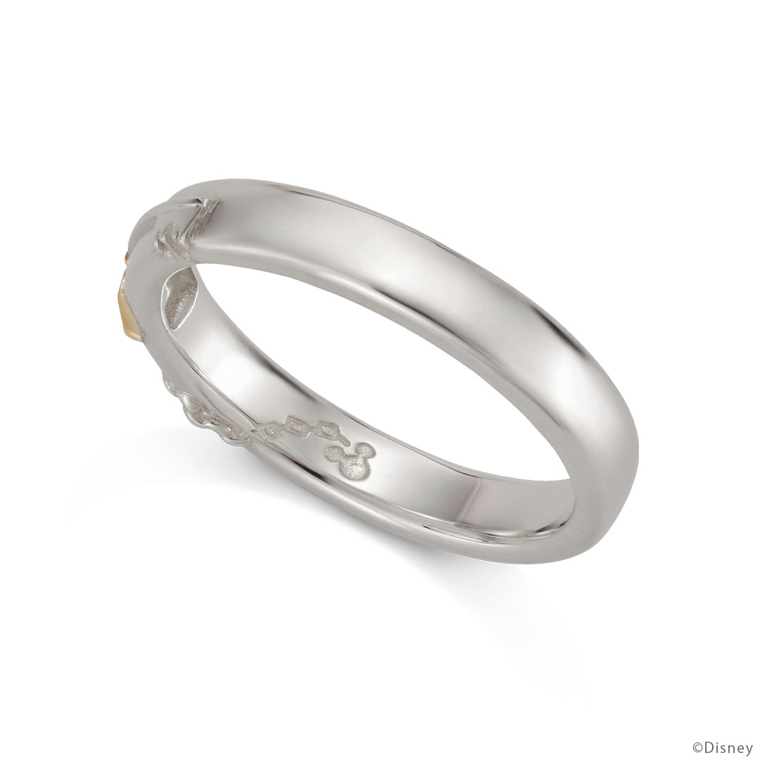 「キングダムチェーン」をモチーフにしたペアリング。表面には鍵を、持ち手から伸びるチェーンは指輪の内側につながる。先にはチャームポイントである“ミッキーマウス”がデザインされて…。シンプルながらも遊び心溢れる指輪は、年齢を重ねても愛せる宝物。