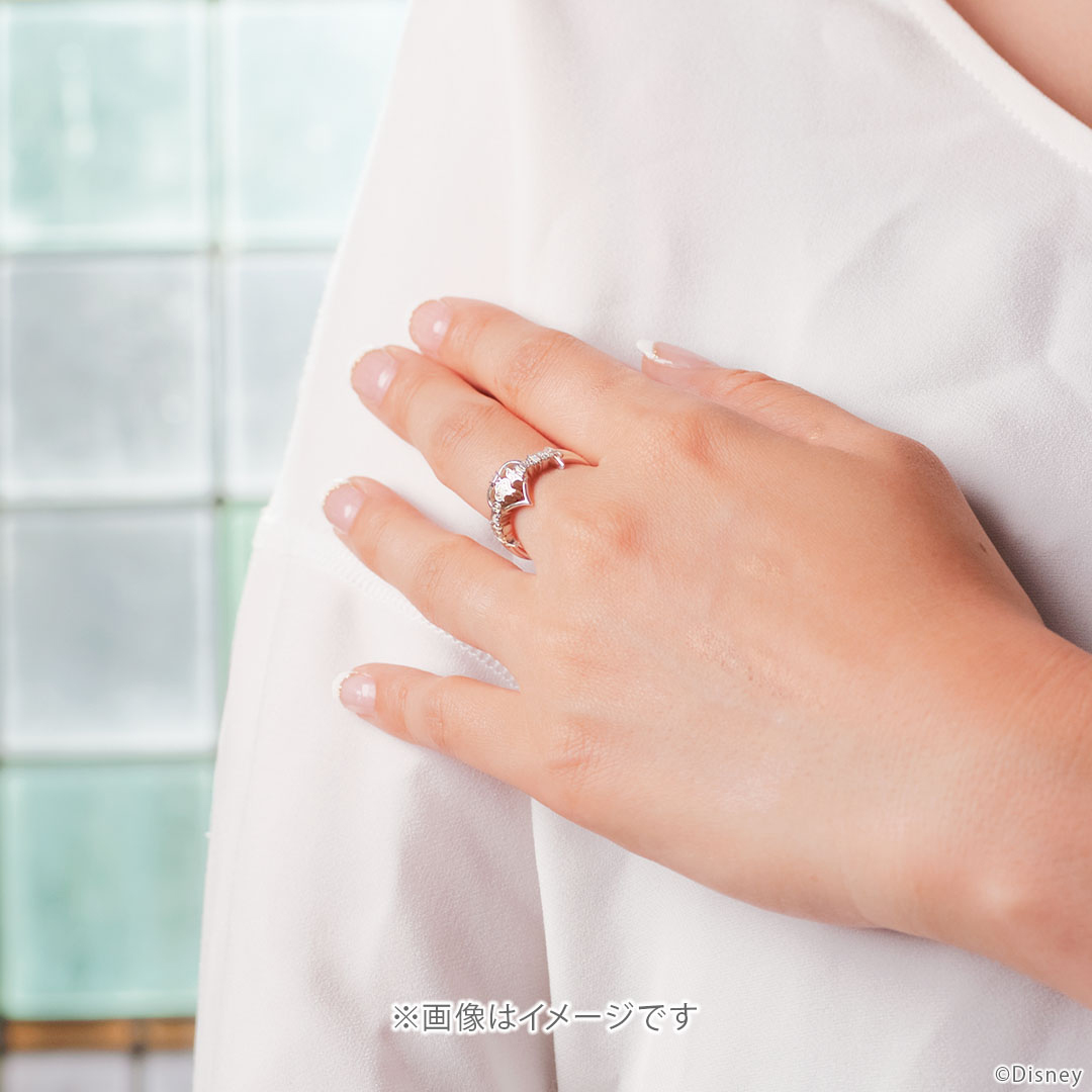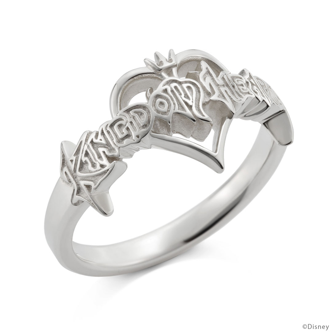 「キングダム ハーツ」を象徴するタイトルロゴをモチーフにしたリング。 平面的なロゴを立体的に表現した繊細なデザイン。ロゴの部分は文字の輪郭部分を凹凸で表現し、ハートモチーフと段差をつけることで奥行きを出しています。