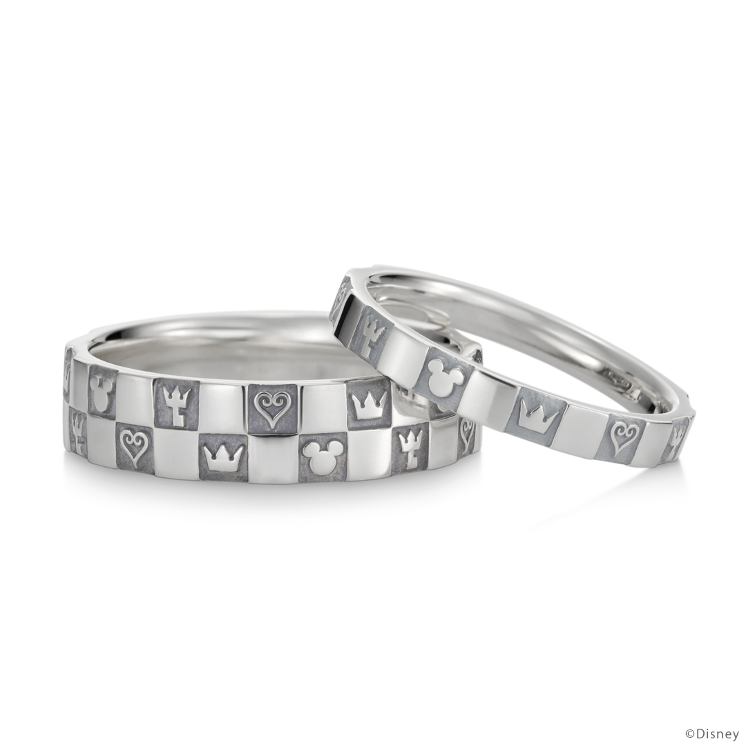 並んだアイコンのように、ひとつひとつの想い出がつながり、重なり、積み上がり、大切な絆になっていくことをイメージして…。『キングダム ハーツ』の代表的なアイコン「ソラが着用しているネックレスの王冠」「ハート」「キーブレード」「ミッキーマウスのアイコン」を配置したリング。チェッカーボードパターンがシックな印象に。