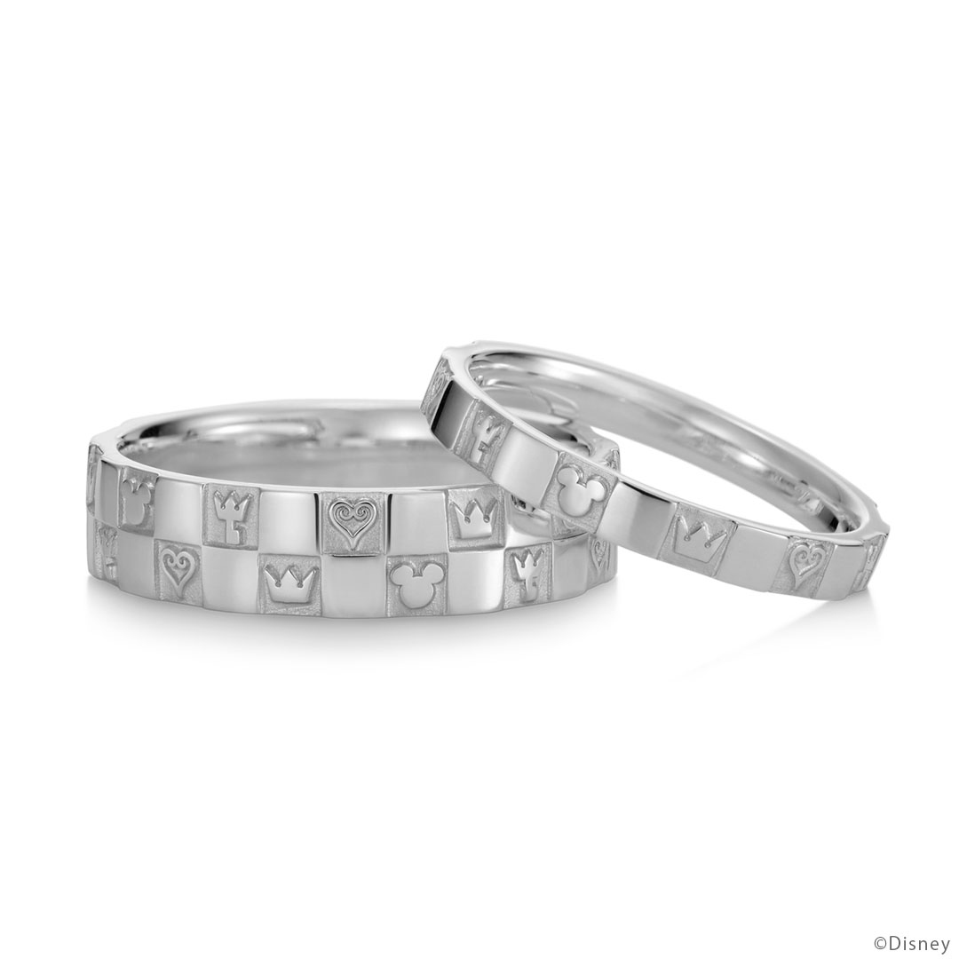 並んだアイコンのように、ひとつひとつの想い出がつながり、重なり、積み上がり、大切な絆になっていくことをイメージして…。『キングダム ハーツ』の代表的なアイコン「ソラが着用しているネックレスの王冠」「ハート」「キーブレード」「ミッキーマウスのアイコン」を配置したリング。チェッカーボードパターンがシックな印象に。