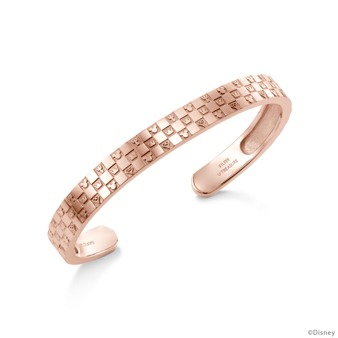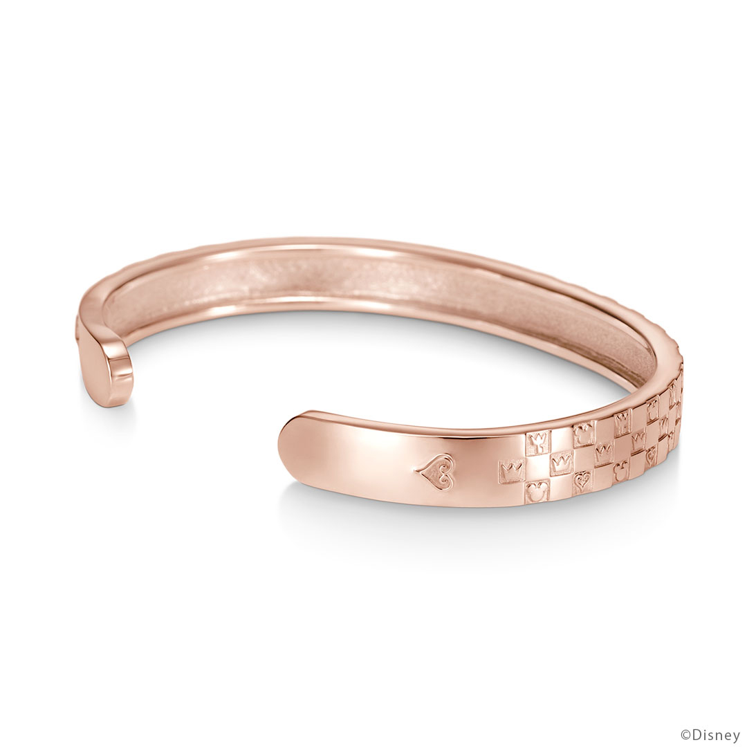 並んだアイコンのように、ひとつひとつの想い出がつながり、重なり、積み上がり、大切な絆になっていくことをイメージして…。『キングダム ハーツ』の代表的なアイコン「ソラが着用しているネックレスの王冠」「ハート」「キーブレード」「ミッキーマウスのアイコン」を配置したバングル。チェッカーボードパターンがシックな印象に。