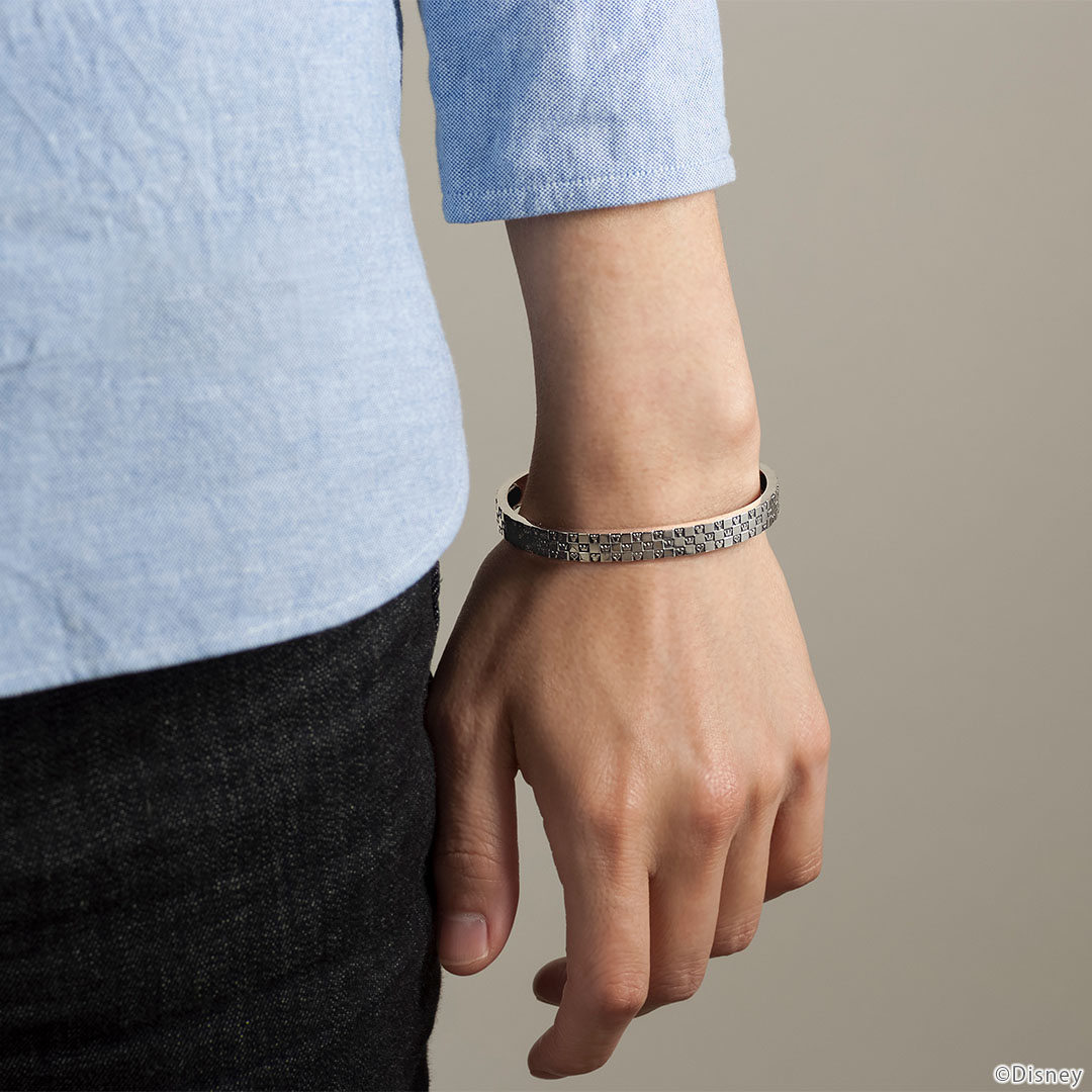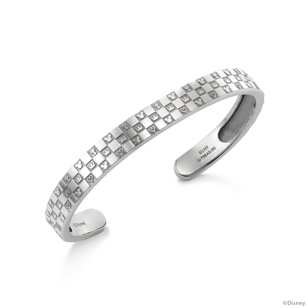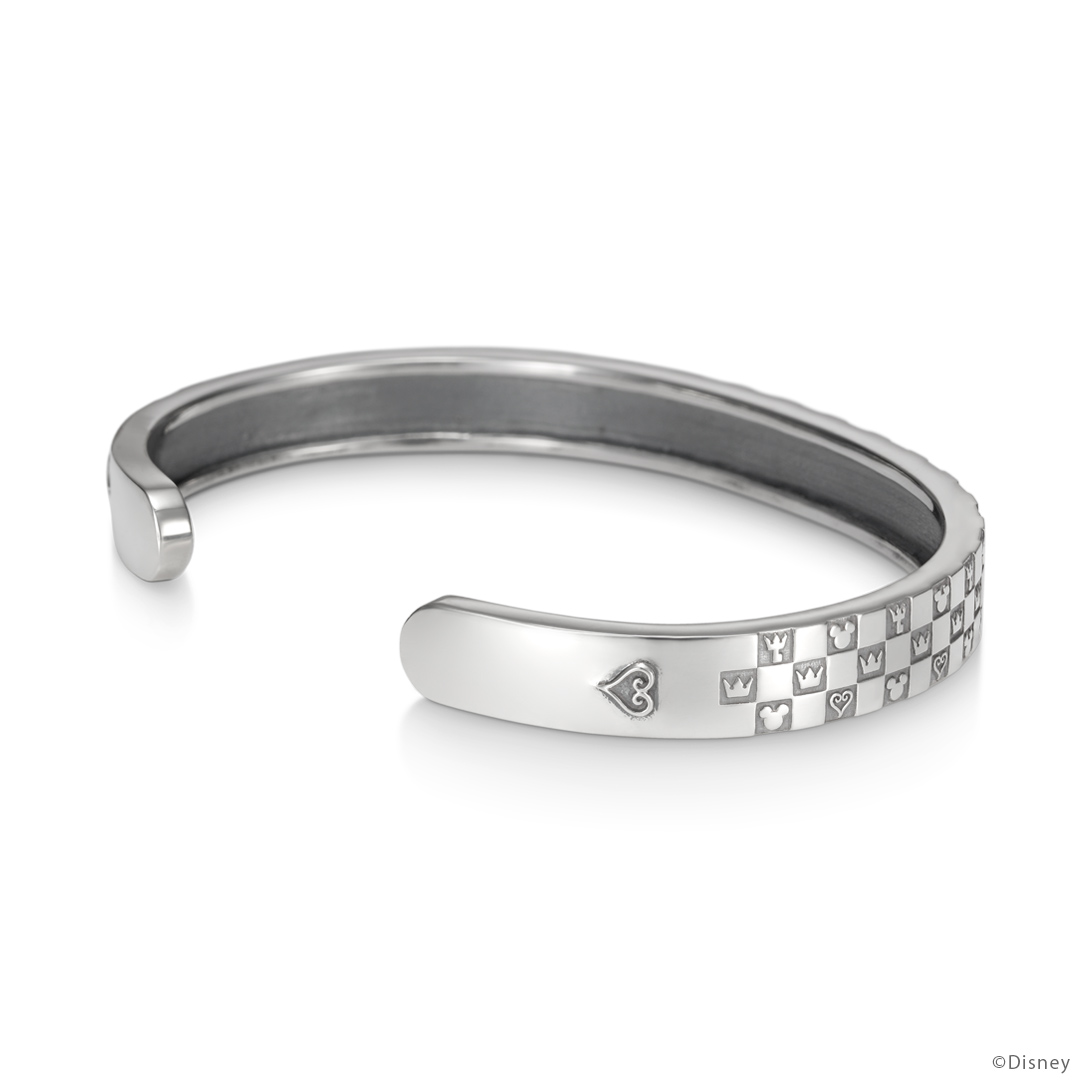 並んだアイコンのように、ひとつひとつの想い出がつながり、重なり、積み上がり、大切な絆になっていくことをイメージして…。『キングダム ハーツ』の代表的なアイコン「ソラが着用しているネックレスの王冠」「ハート」「キーブレード」「ミッキーマウスのアイコン」を配置したバングル。チェッカーボードパターンがシックな印象に。
