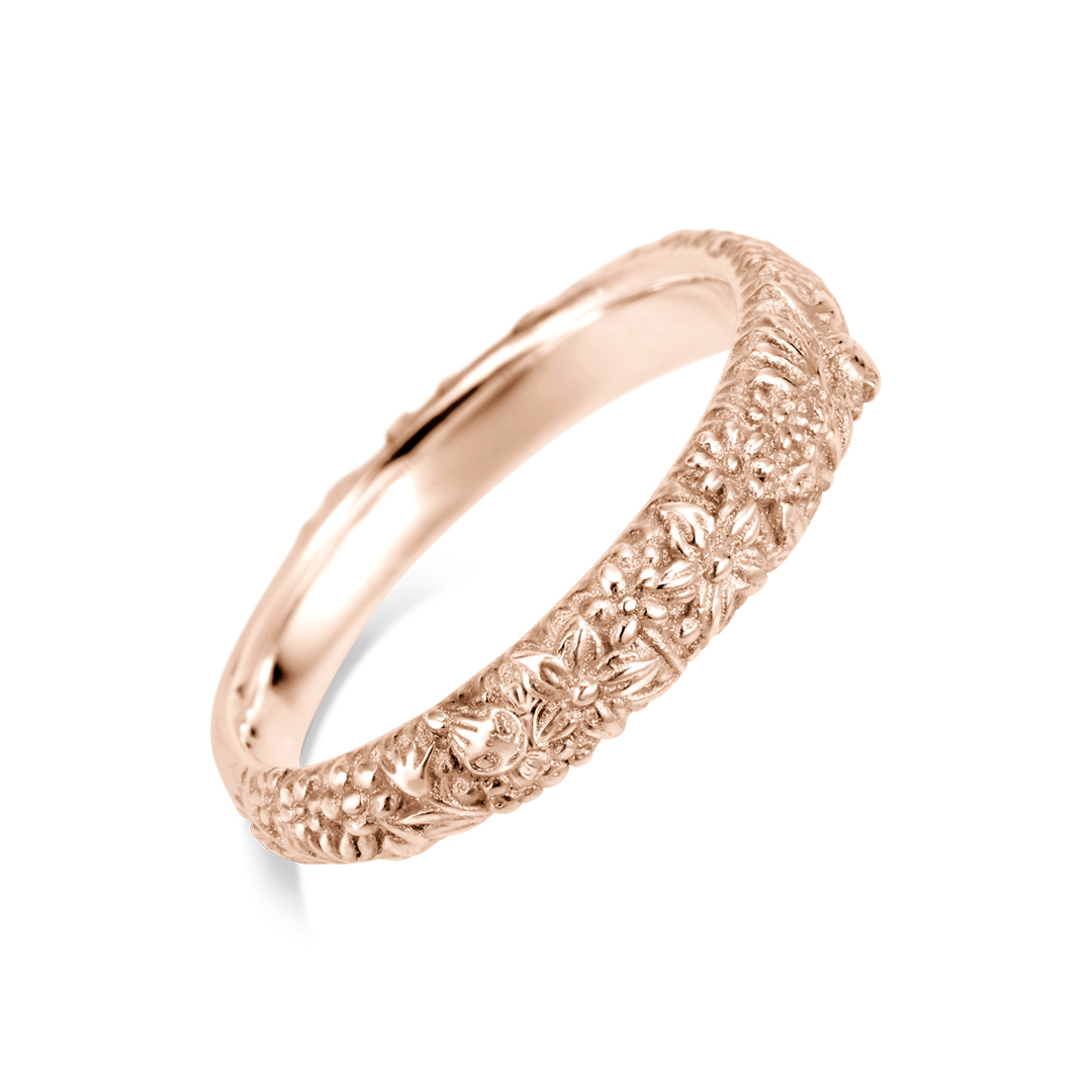 春になると花が咲き乱れるムーミン谷。そのムーミン谷に咲く花や植物をイメージしたレリーフ状の彫模様が美しい結婚指輪。ナチュラルな雰囲気が漂うなか、よーく見るとムーミンのほかにリトルミイやスノークのおじょうさんもチラリと顔をのぞかせるという遊び心が。