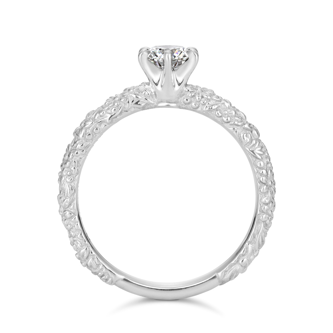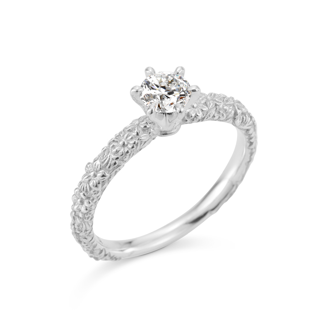春になると花が咲き乱れるムーミン谷。 そのムーミン谷に咲く花や植物をイメージした婚約指輪。 中央のダイヤモンドは、まるでムーミン谷を照らす太陽のよう! 定番の一粒石婚約指輪ながらも、レリーフ状の彫模様が人とは違った個性をプラスしています。