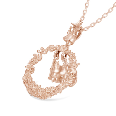 春になると花が咲き乱れるムーミン谷。そのムーミン谷で楽しげに遊ぶキャラクターたちをイメージして作られたネックレス。中央には仲良くブランコに乗るムーミンとスノークのおじょうさんが。身に着けるとブランコがゆらゆらと揺れ、視線を集めます。
