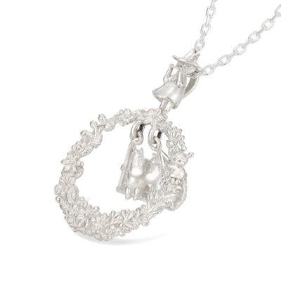 春になると花が咲き乱れるムーミン谷。そのムーミン谷で楽しげに遊ぶキャラクターたちをイメージして作られたネックレス。中央には仲良くブランコに乗るムーミンとスノークのおじょうさんが。身に着けるとブランコがゆらゆらと揺れ、視線を集めます。