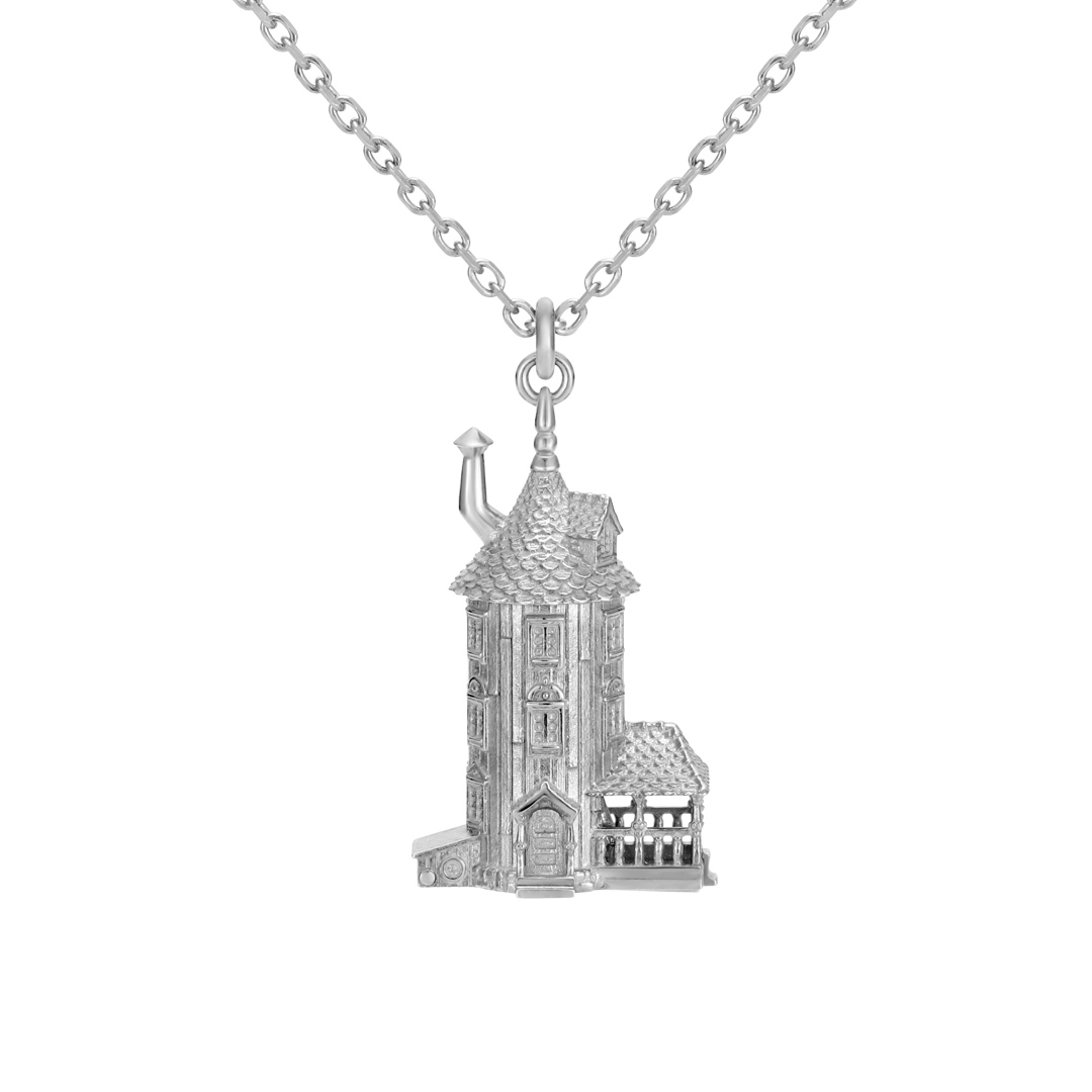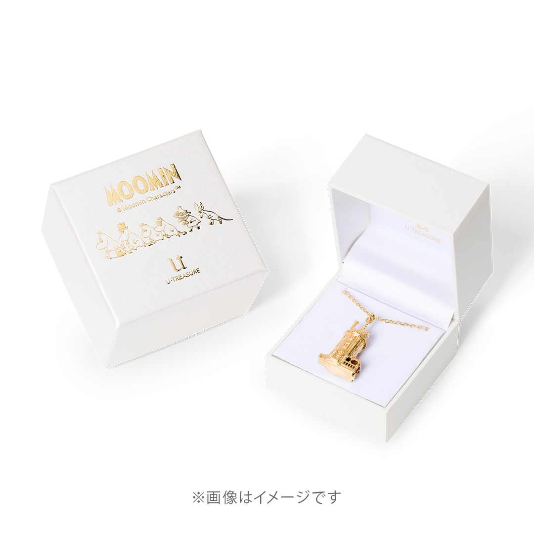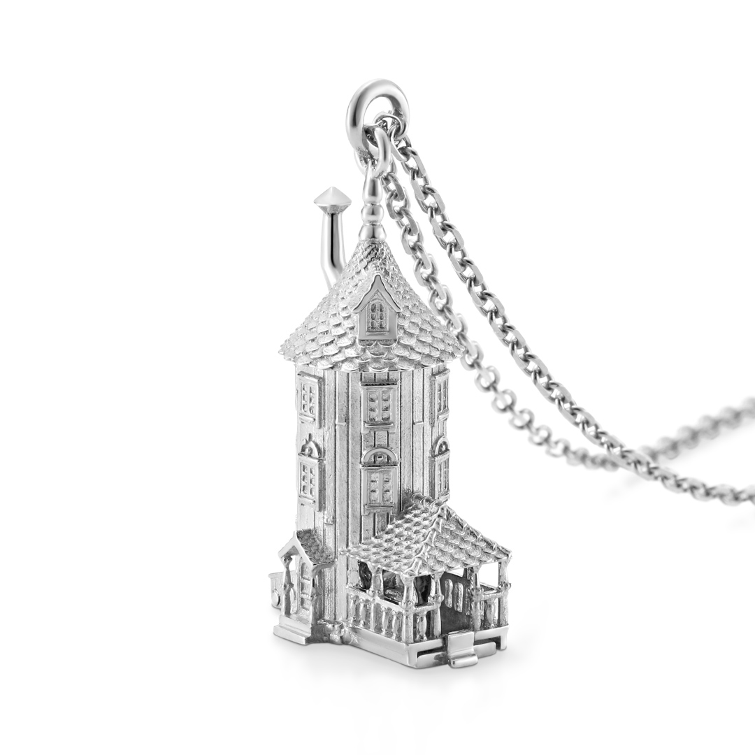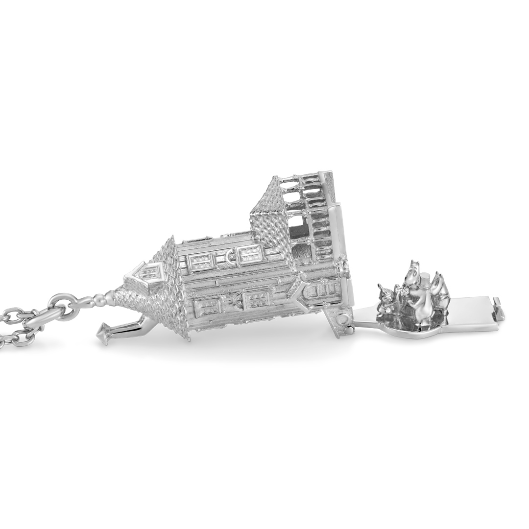 ムーミン一家が暮らし、大勢のお客さんが訪れるムーミンハウスをフル立体化したネックレスです。あたたかみのある家の再現度はもちろん、ベランダから家の中にいる一家とリトルミイが覗けるところなど、ディテールにまでこだわり繊細に作り込んでいます。ベランダの階段部分にあるツマミからは、家の底面を開けることができます。