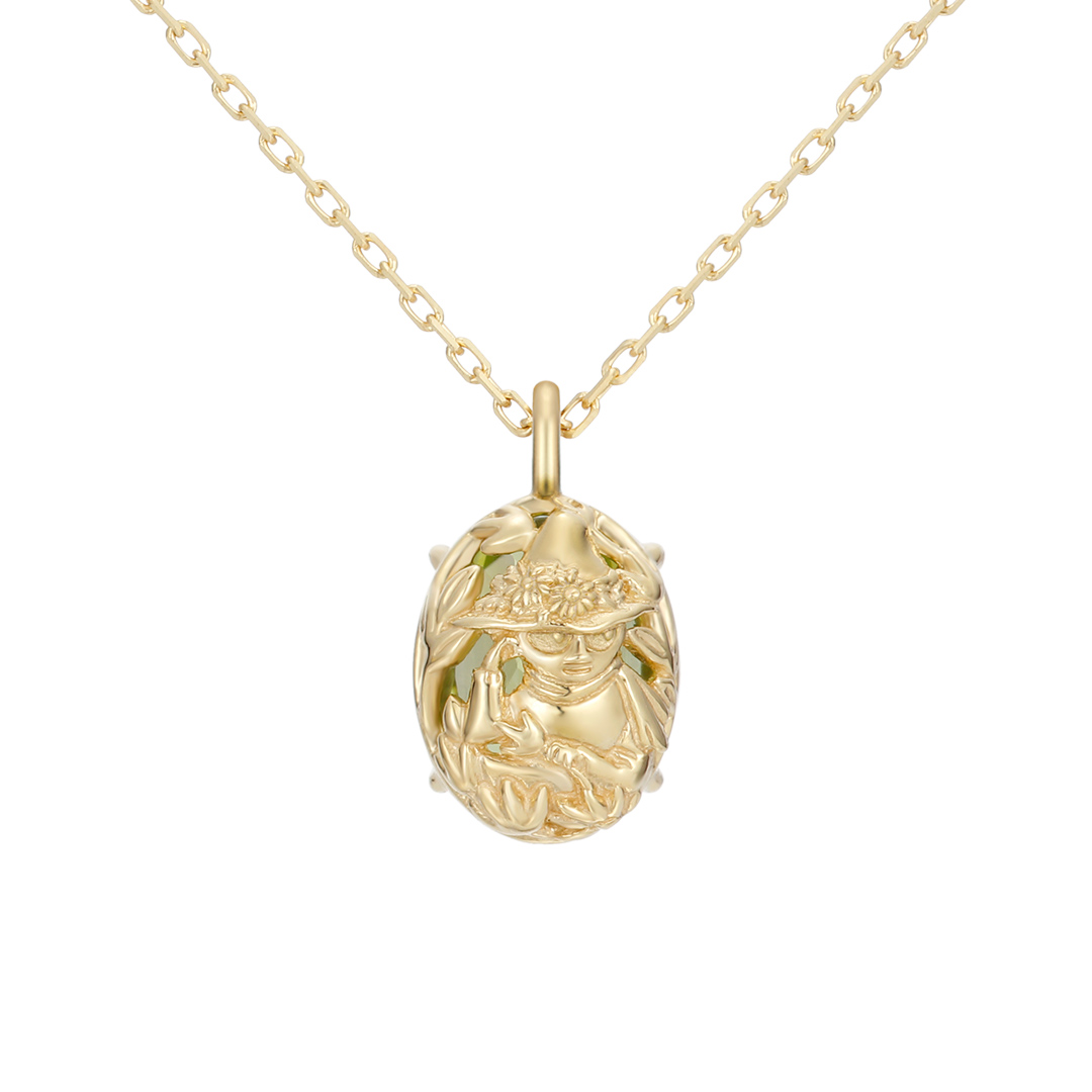 ムーミン谷の仲間と、イメージカラーの宝石でデザインしたネックレス。ネガティブな力を取り除き、ポジティブな力を授けてくれるという石言葉を持つ「ペリドット」と、裏面はスナフキンの組み合わせ。