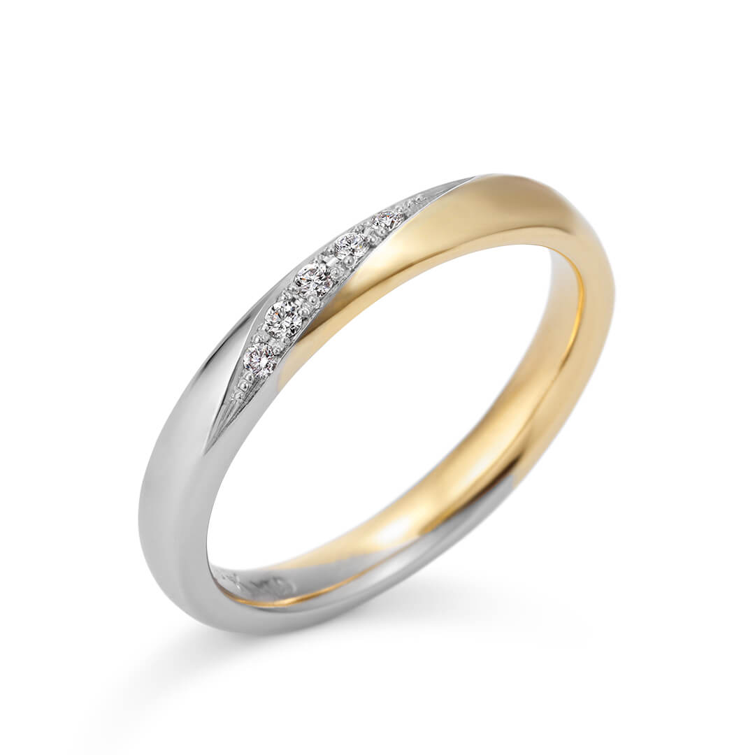 女性用は中央に配したダイヤがさりげなくきらめき、華やかな印象を演出。男性用はイエローゴールド部分につや消し(マット加工)を施しているため、落ち着いた雰囲気に。