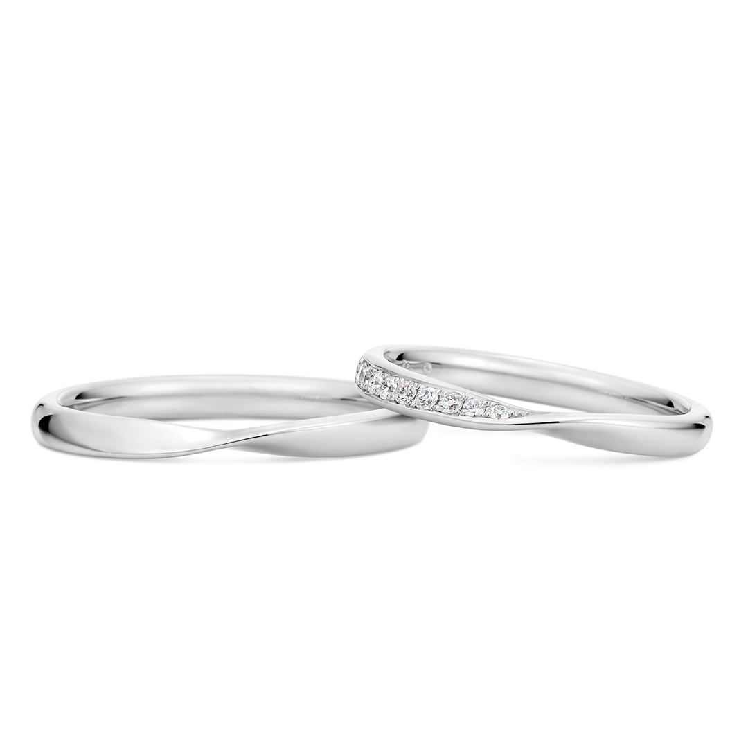 シンプルながらも、きゅっとひねったデザインはほどよいアクセントに。ストレートラインの婚約指輪と重ね着けしやすい結婚指輪です。