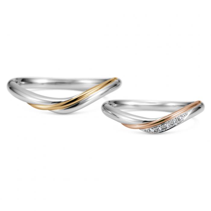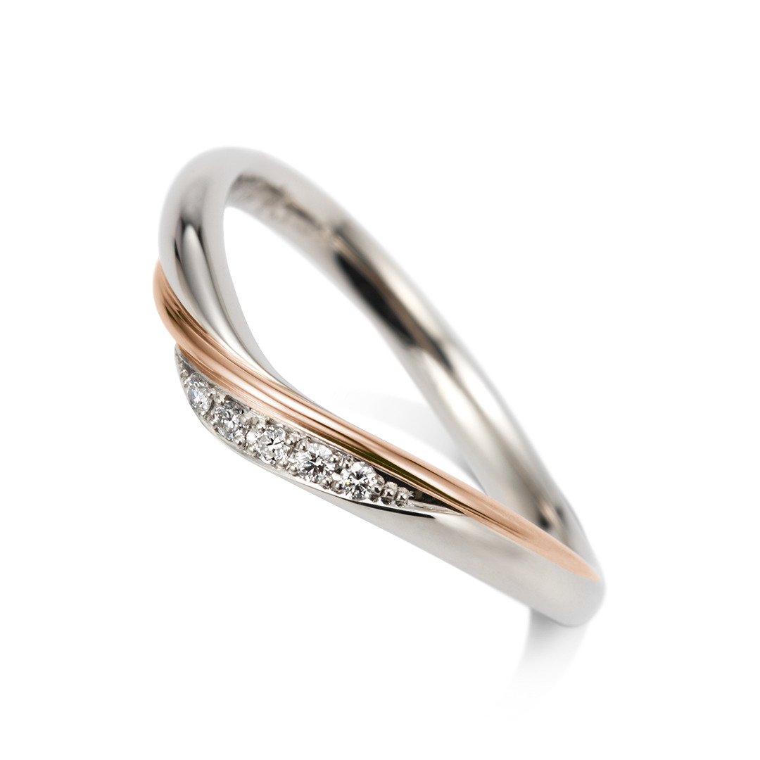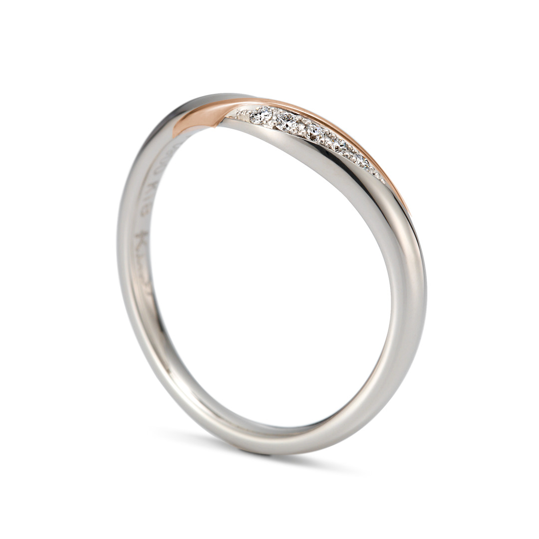 流れるようなカラーゴールドのラインがデザインのアクセントに。プラチナとゴールドのコンビネーションリングは、清楚な印象の中にどこかぬくもりを感じさせ、肌なじみよく身に着けられます。