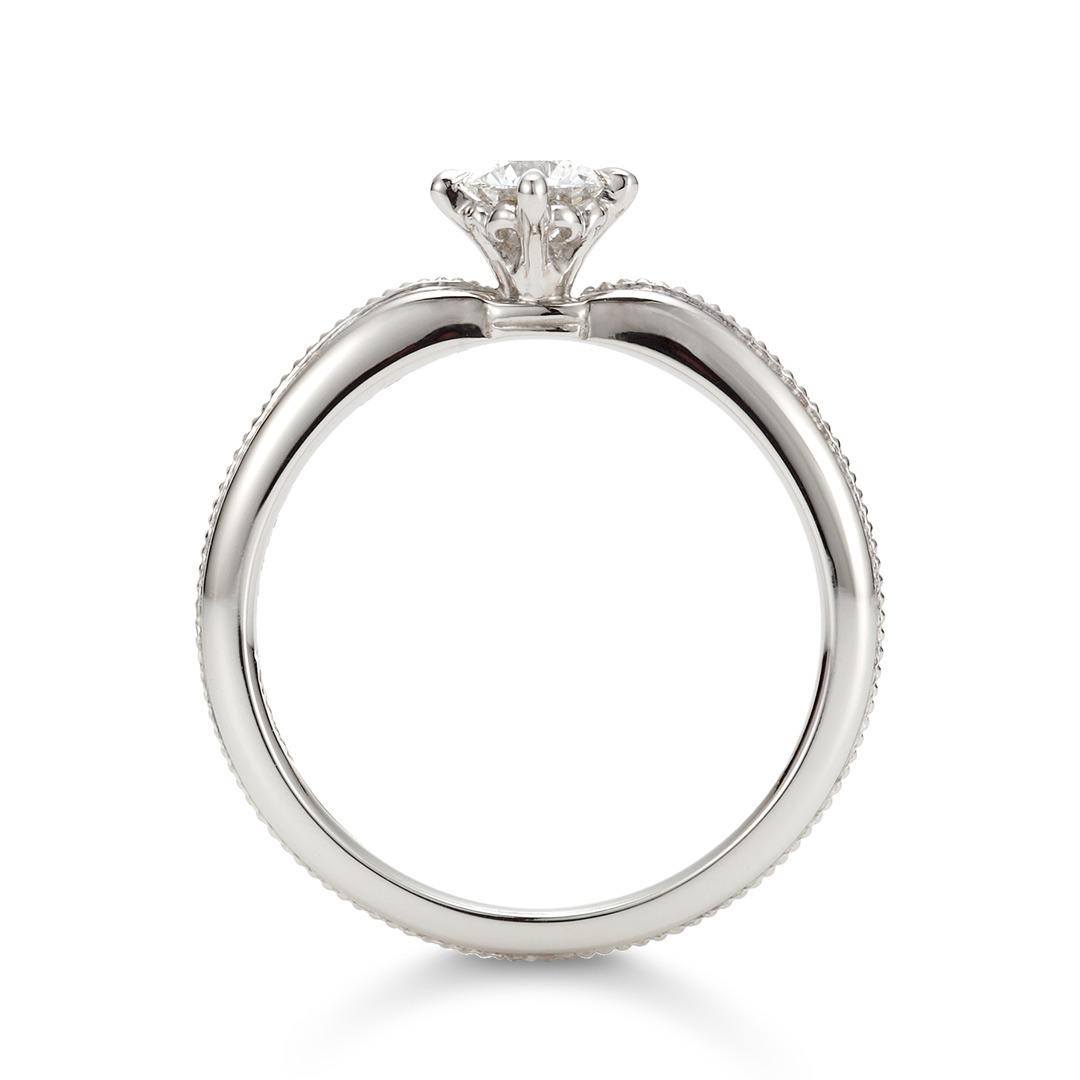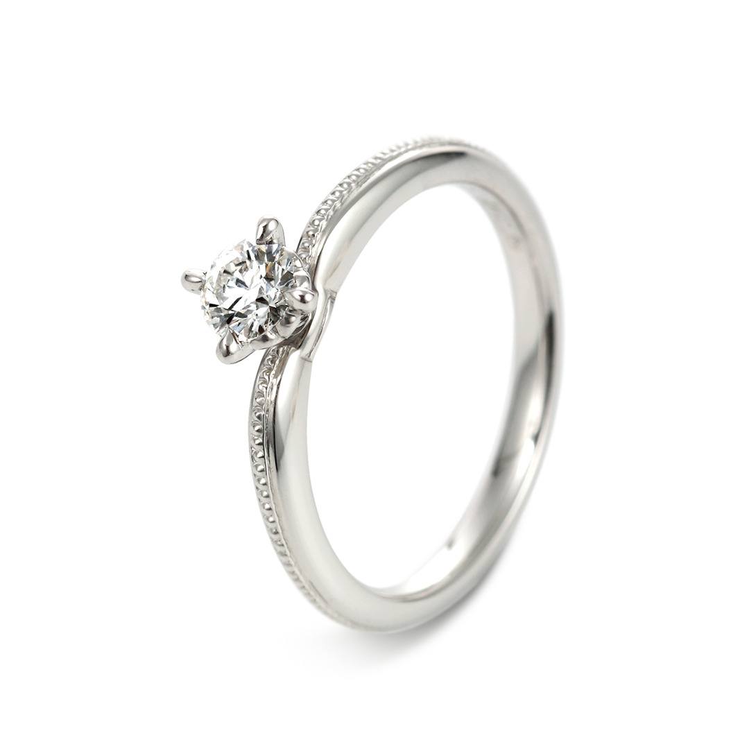 職人が手作業で入れた粒の装飾「ミル打ち」がアンティークなデザイン。華奢で繊細なアームがダイヤの存在感を惹きたてます。