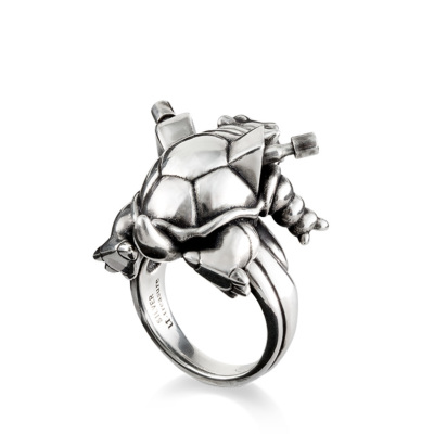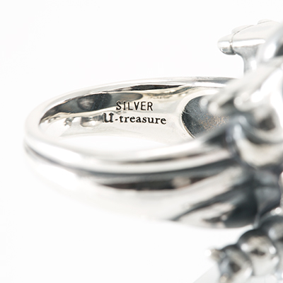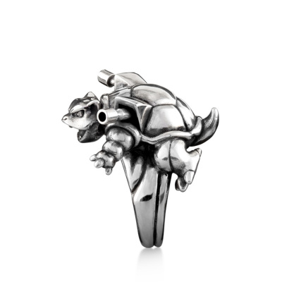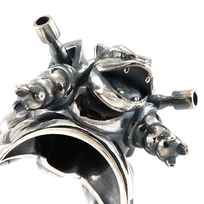 硬い甲羅と、そこから覗く筒状の墳射口。 さらには足の裏の模様までも忠実に再現した、ボリュームあるシルバーリングです。 着け心地にもこだわり、手の平側の厚みは抑えめにして仕上げました。