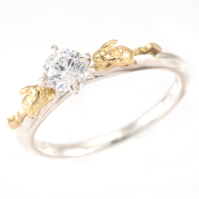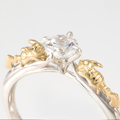 オスとメスの“ピカチュウ”が仲良くキュービックジルコニアを見つめているキュートなデザイン。二体の“ピカチュウ”に囲まれることで、キュービックジルコニアがより華やかに輝いて見えます。これから始まる新しい人生のスタートを“ピカチュウ”が祝福してくれているような、ハッピー感あふれるリング♪