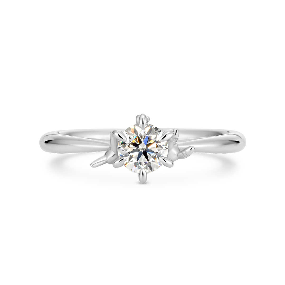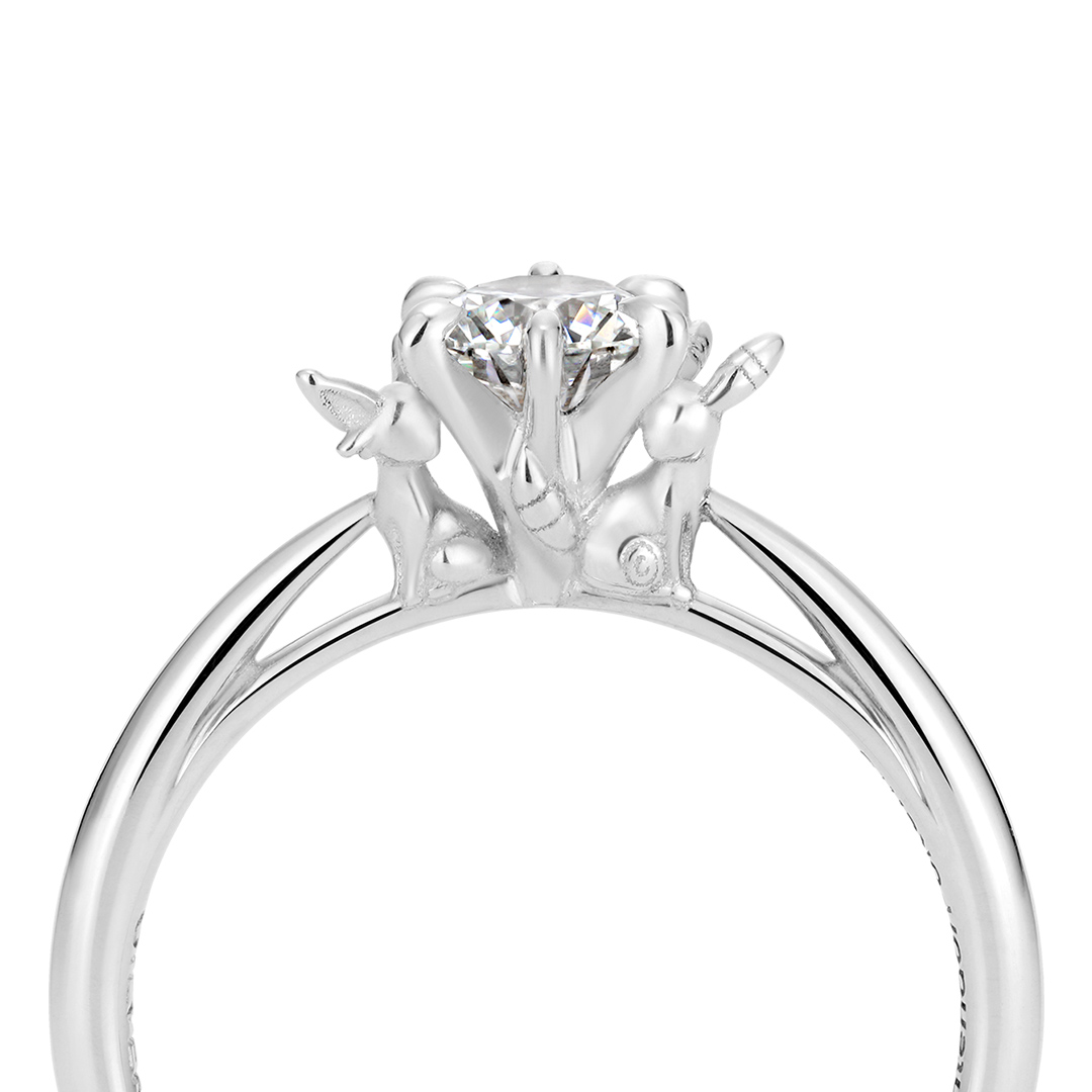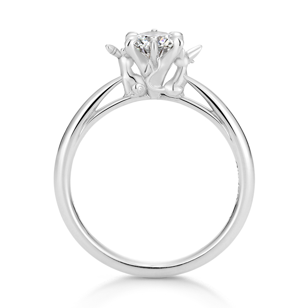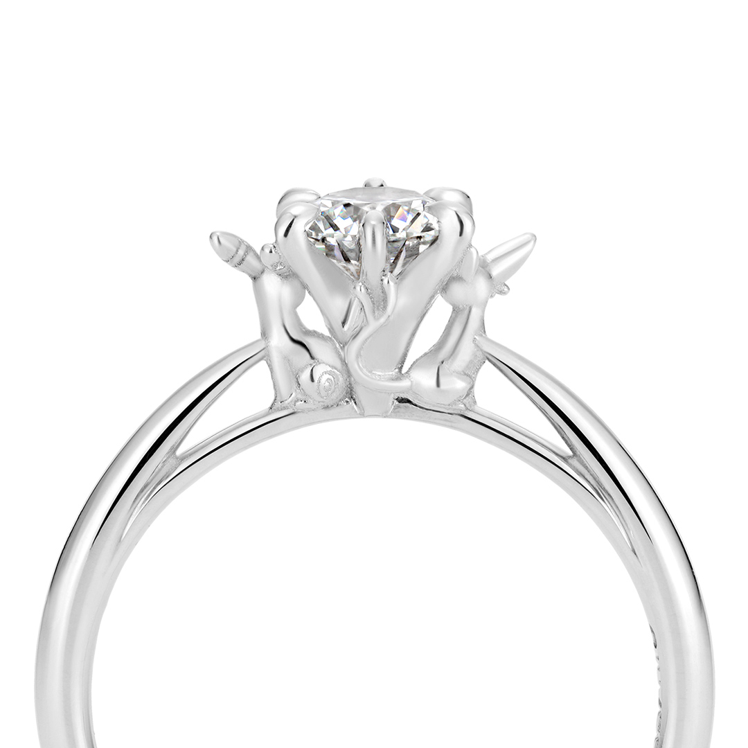 エーフィとブラッキーが、宝石の前にたたずむ婚約指輪。 これから始まる新しい人生のスタートをポケモンと一緒に。 上から見た様子は、シンプルな王道デザインの婚約指輪のよう。 エーフィとブラッキーの耳がちょこんと見えるのが、愛らしいポイントに。