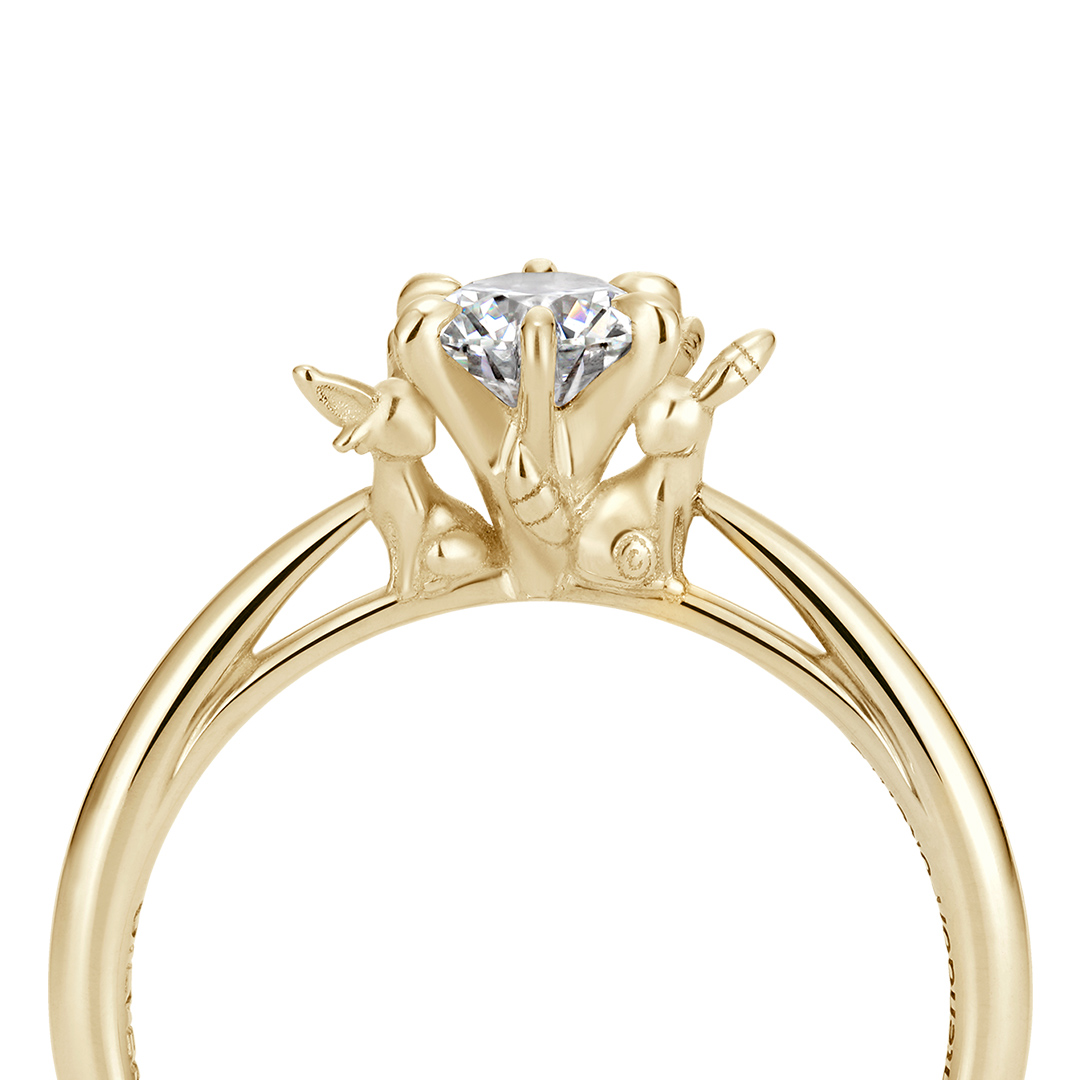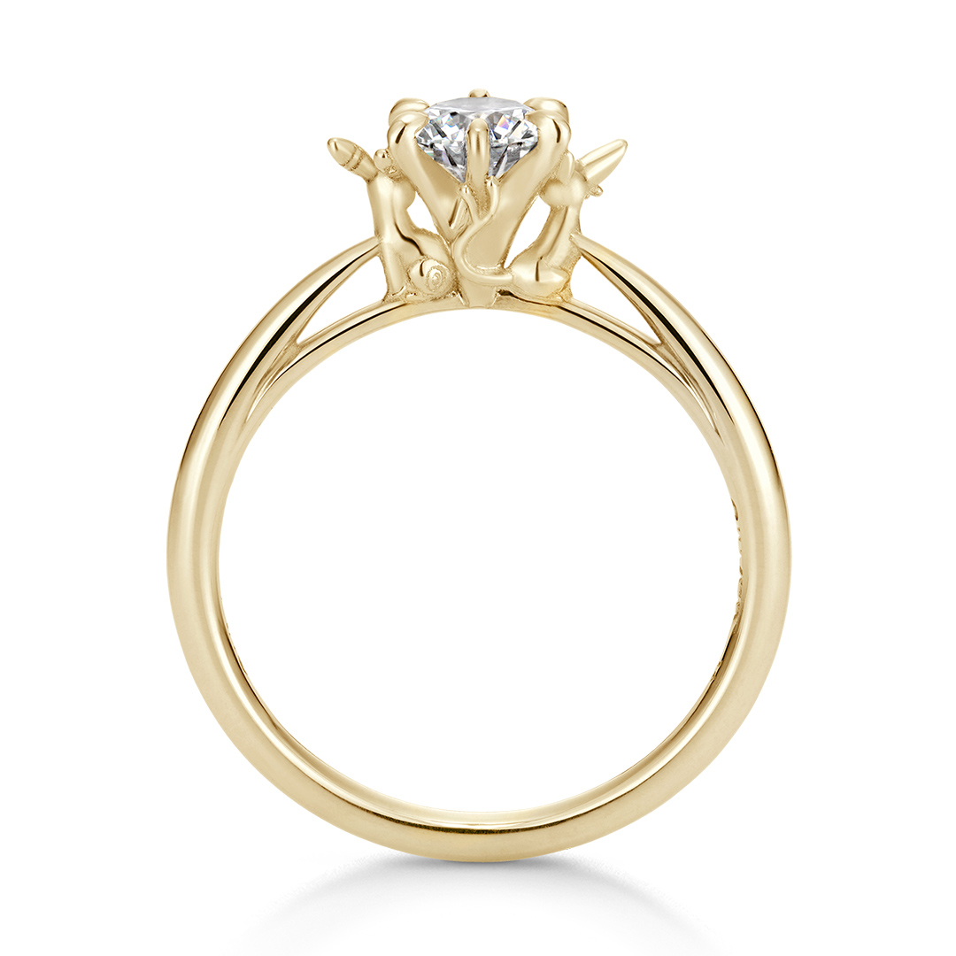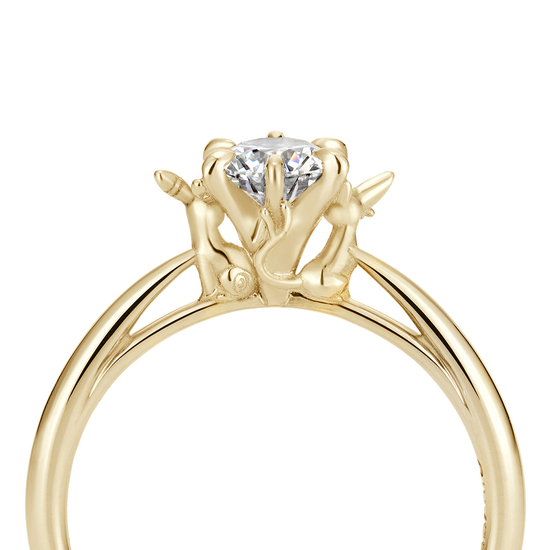 エーフィとブラッキーが、宝石の前にたたずむ婚約指輪。 これから始まる新しい人生のスタートをポケモンと一緒に。 上から見た様子は、シンプルな王道デザインの婚約指輪のよう。 エーフィとブラッキーの耳がちょこんと見えるのが、愛らしいポイントに。