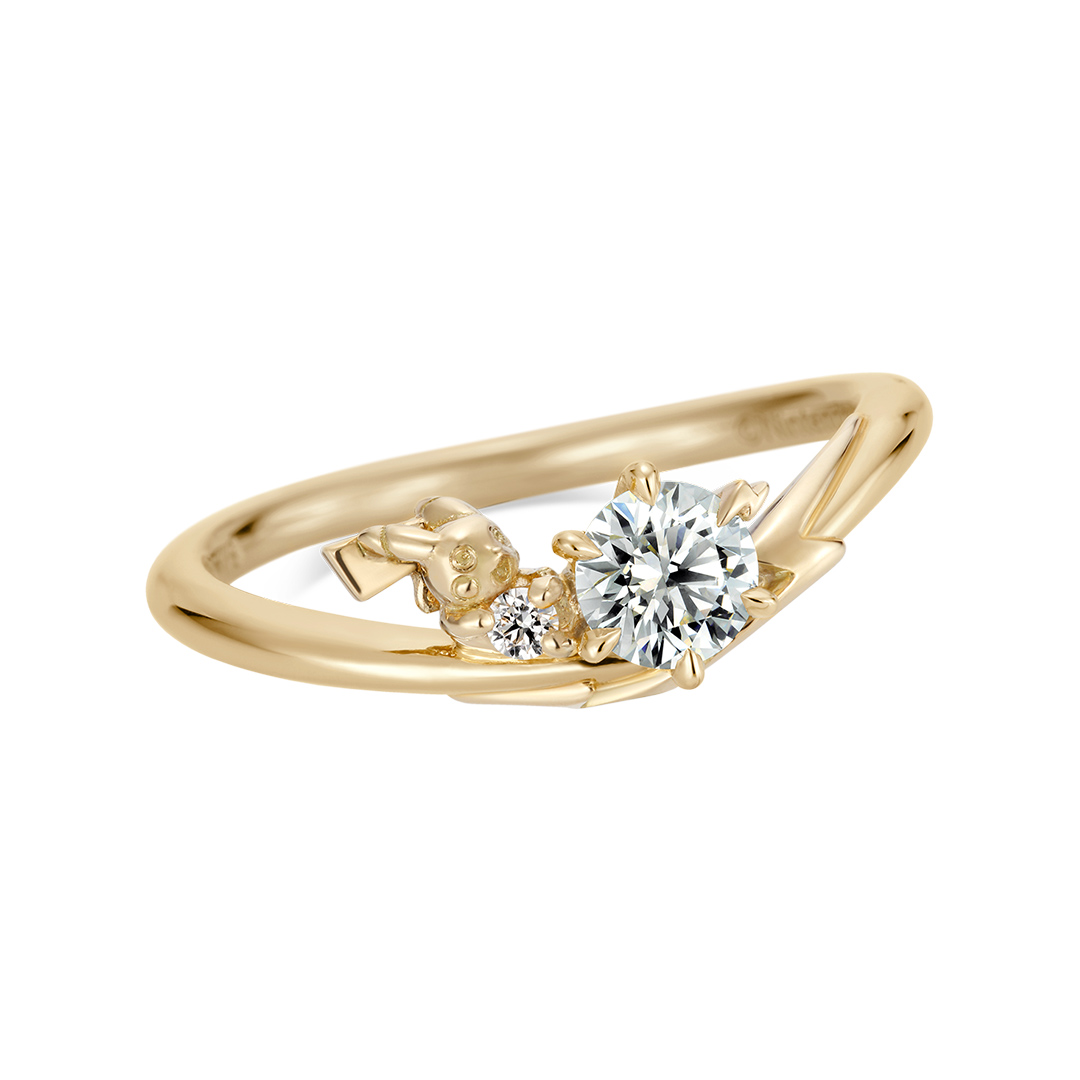 身体中に電気が走る、運命的な出会い。 これから始まる新しい人生のスタートを“ピカチュウ”が祝福してくれているような婚約指輪。 メレダイヤモンドを抱えた“ピカチュウ”が微笑む、愛らしさあふれるデザイン。手元を見つめるたびハッピーな気分に。