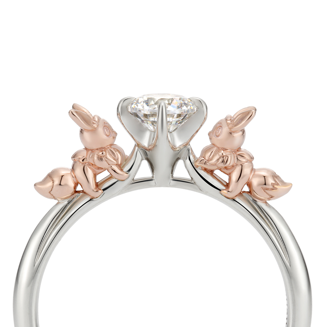オスとメスの“イーブイ”が仲良くキュービックジルコニアを見つめているキュートなデザイン。 これから始まる新しい人生のスタートを“イーブイ”がやさしく見守ってくれているようです。