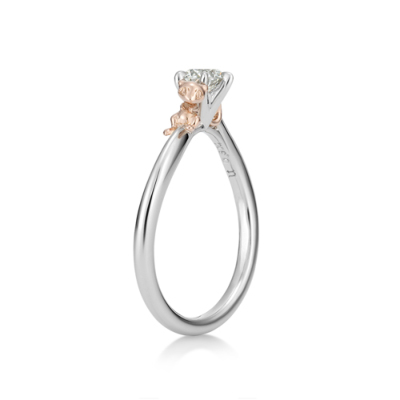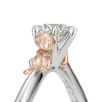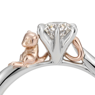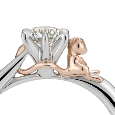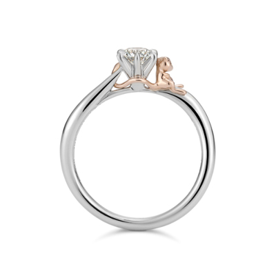 大切な人と出会えた奇跡と、きよらかな心と強い気持ちをもち続けられますように――。ピンクゴールドカラーの幻のポケモン“ミュウ”が、宝石の横にちょこんと座っている様子が愛らしいデザイン。上から見た様子は、緩やかなウェーブラインがエレガントな婚約指輪。中央に向かってアームが細く絞られているため、中央のダイヤモンドの華やかさがより一層引き立ちます。