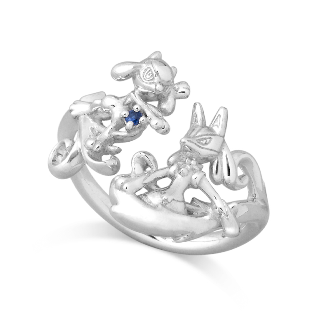 リオルとルカリオのフォークリング。2匹をイメージしたブルーサファイアをアクセントにクールにポーズを決める2匹を1本のリングにデザインしました。