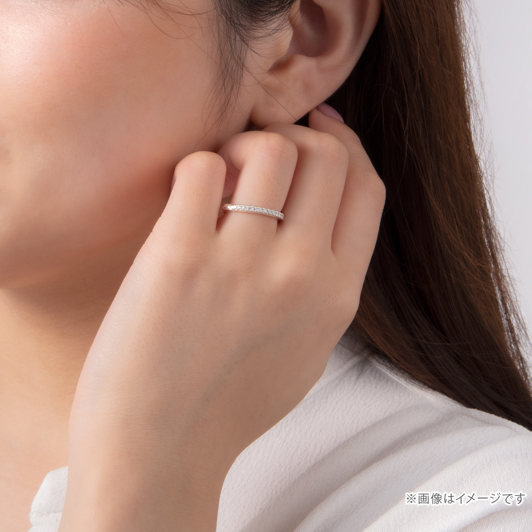 シンプルでエレガントなハーフエタニティリング。ダイヤモンドを留めた両サイドに