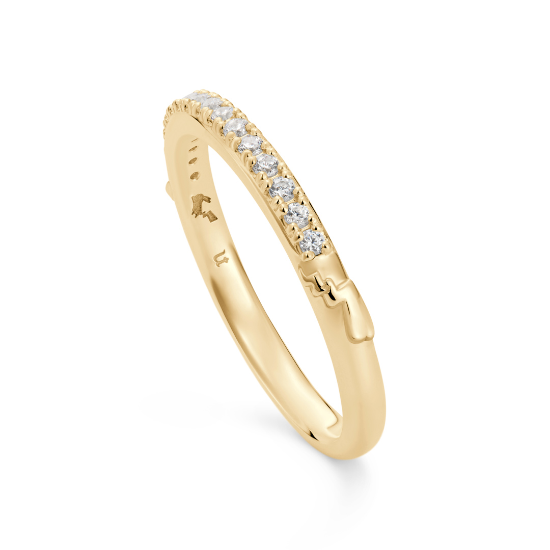 シンプルでエレガントなハーフエタニティリング。ダイヤモンドを留めた両サイドに
