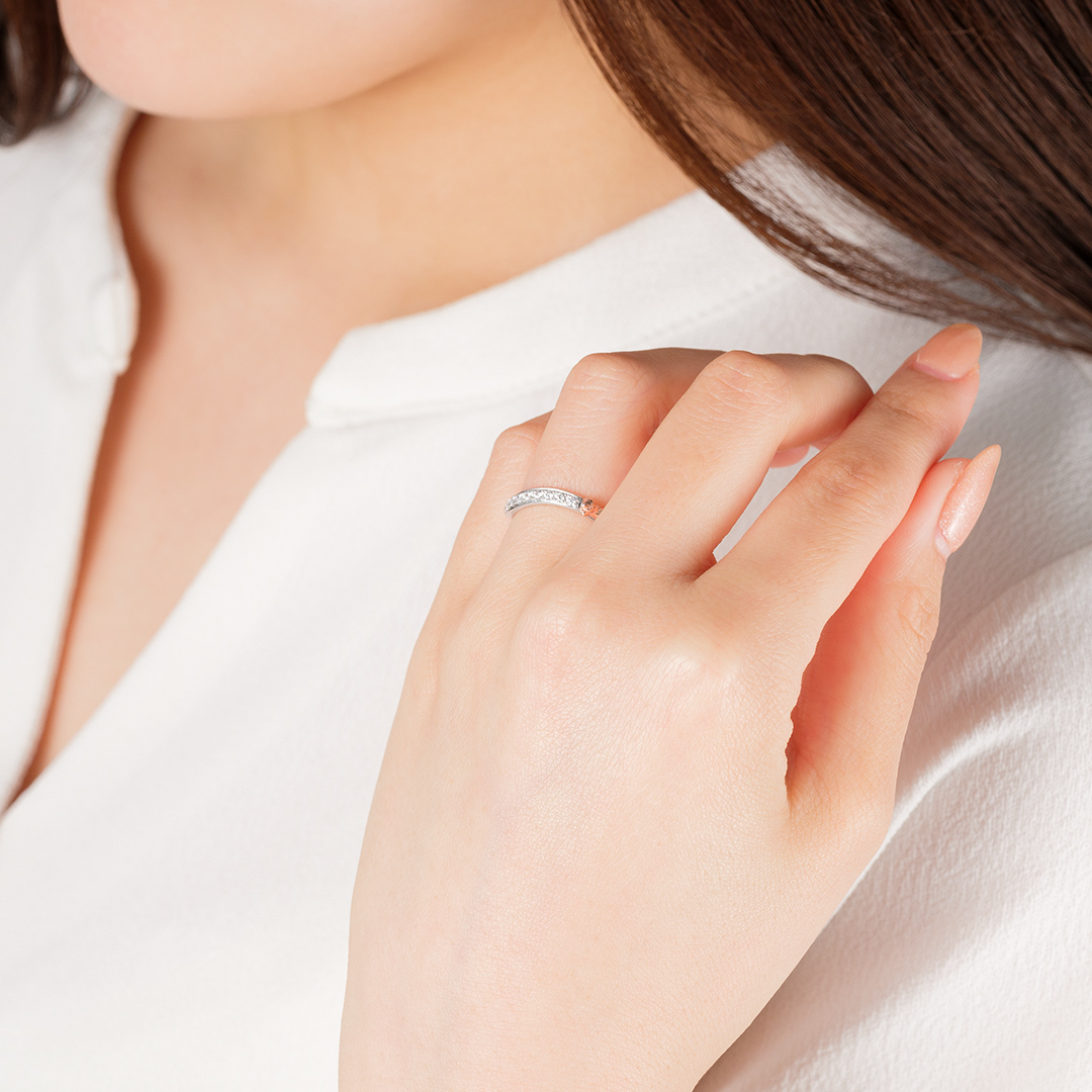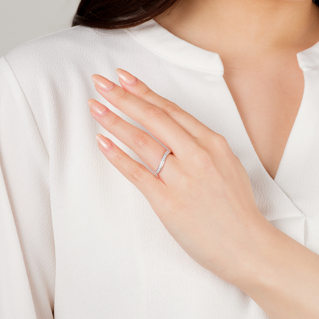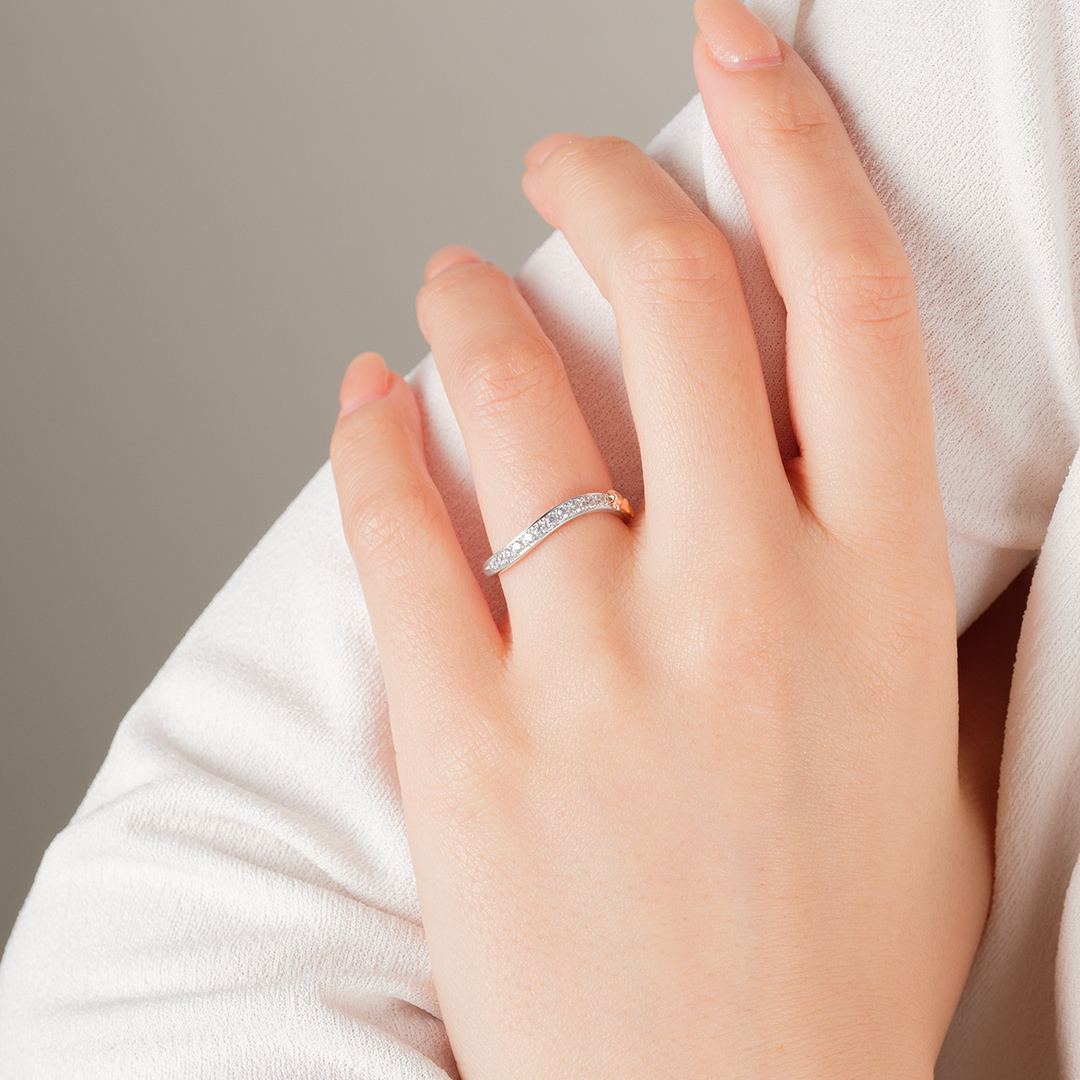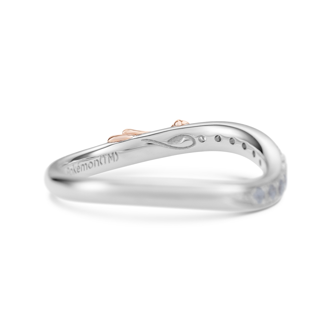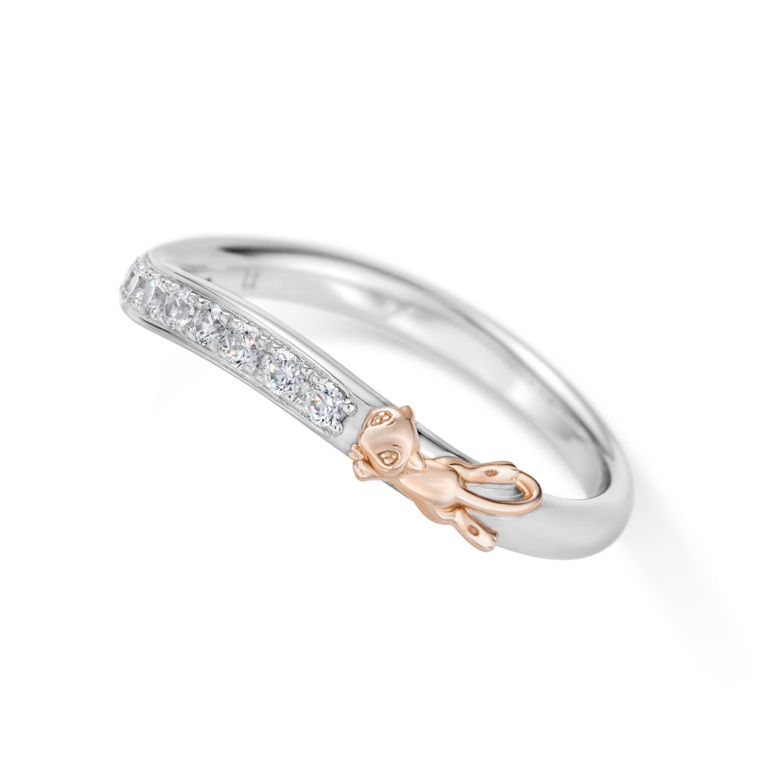 シンプルでエレガントなハーフエタニティリング。正面につらなるダイヤモンドのサイドで、ミュウが気持ちよさそうに飛んでいます。