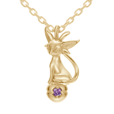 “エーフィ”がモンスターボールの上にちょこんと乗ったデザイン。 “エーフィ”の上品でしなやなかなフォルムや表情まで立体的に再現。 モンスターボールには、“エーフィ”をイメージした紫色の宝石・アメシストが留められています。 さりげなく身に着けられるサイズで、さまざまなファッションに取り入れられるのも魅力。