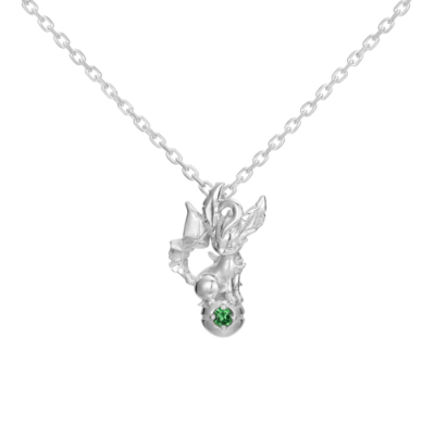 “リーフィア”がモンスターボールの上にちょこんと乗ったデザイン。 “リーフィア”の植物のような静かで優しい姿、特徴的なフォルムの耳や尻尾など細部に至るまで360度立体的に再現しました。 モンスターボールには、“リーフィア”をイメージした宝石・グリーンガーネットを留めています。