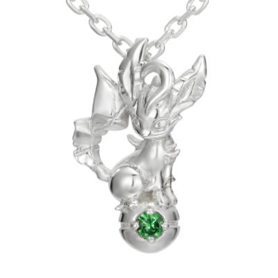 “リーフィア”がモンスターボールの上にちょこんと乗ったデザイン。 “リーフィア”の植物のような静かで優しい姿、特徴的なフォルムの耳や尻尾など細部に至るまで360度立体的に再現しました。 モンスターボールには、“リーフィア”をイメージした宝石・グリーンガーネットを留めています。