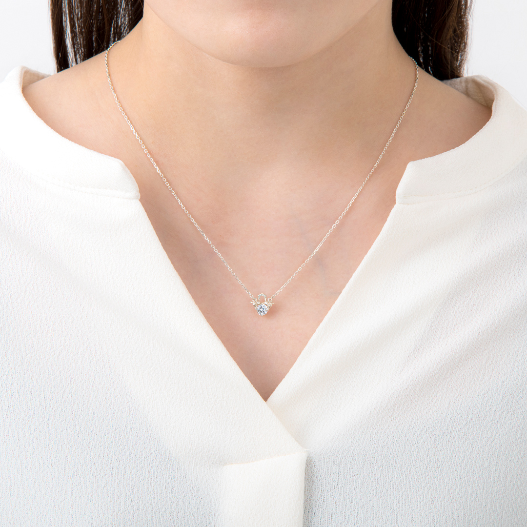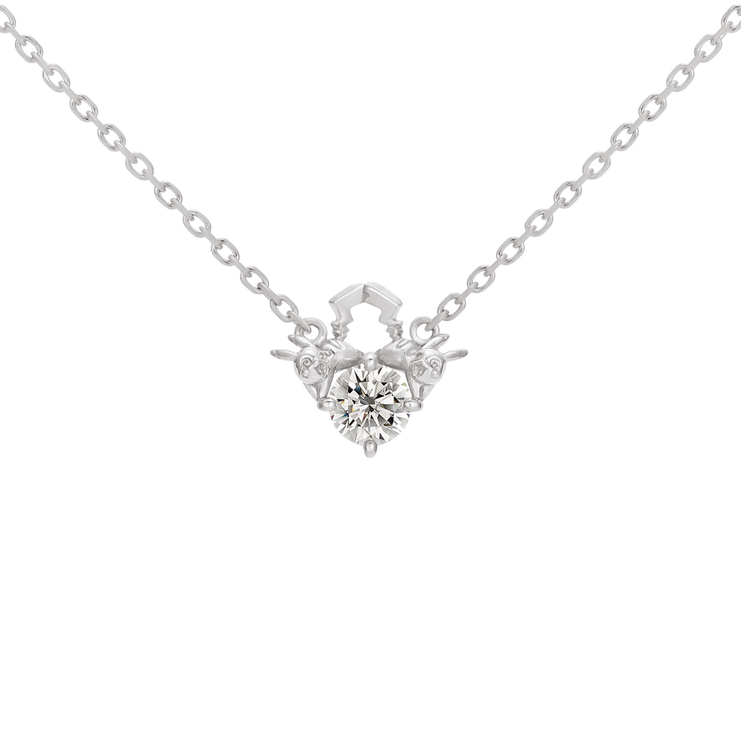 オスとメスの“ピカチュウ”が仲良く一粒石を運んできてくれたようなデザインのネックレス。二匹の“ピカチュウ”と一緒に一粒石が胸元で華やかに輝きます。