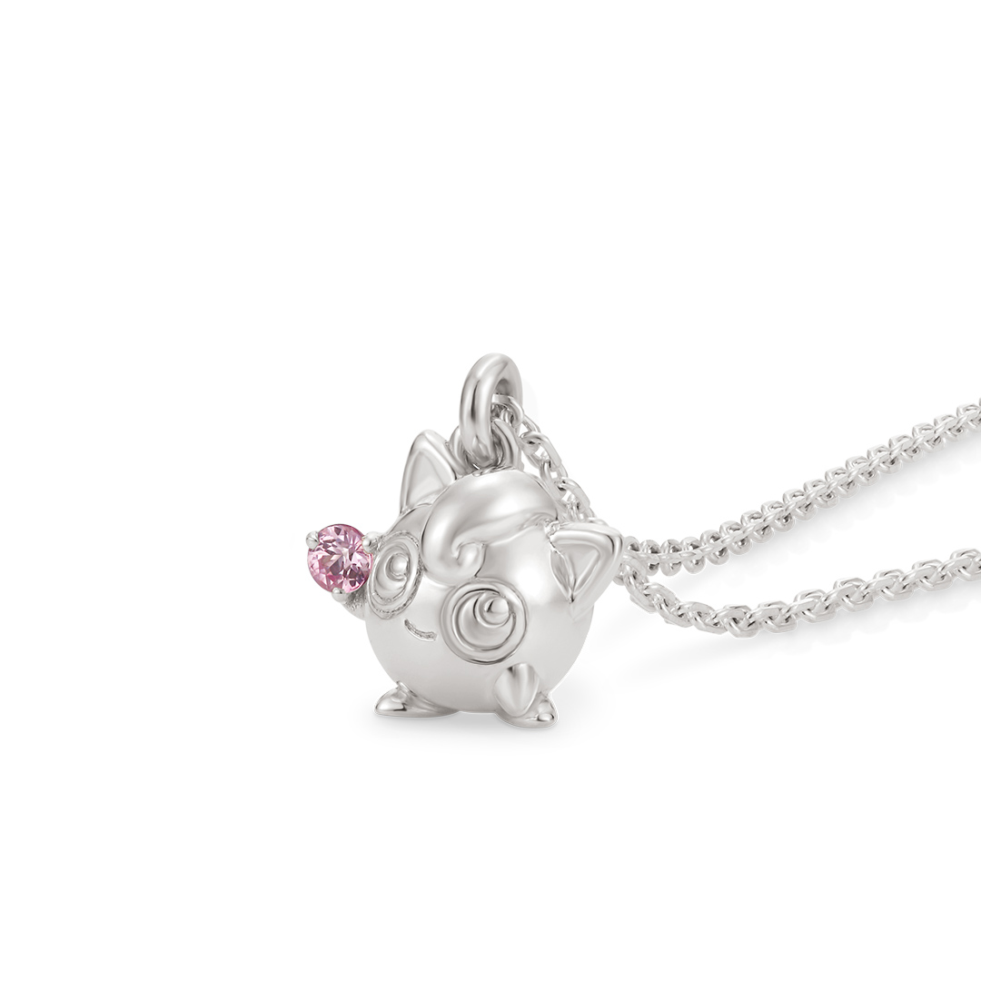 ふうせんポケモン“プリン”のネックレス。立体的なデザインにすることでチャームポイントのまるい体や、大きな瞳まで細密に表現しました。なかなか眠れない時は、そっと耳を澄ませてみて。