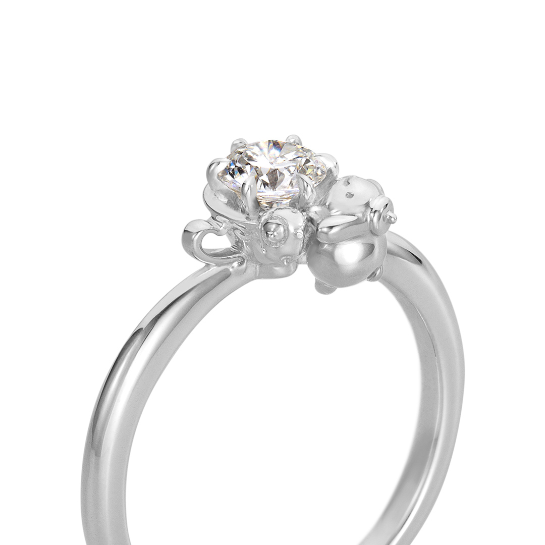 「いつも心穏やかにいられますように…。」 “ポムポムプリン”と“マフィン”のティータイムを表現したリング。 ふたりのチャームポイントであるお尻もキュートにデザイン。