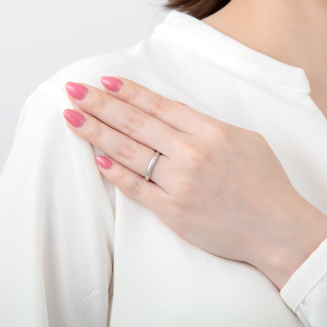 チャームポイントのお尻をぷっくりとデザインしました。リングの内側には、“ポムポムプリン”と“マフィン”が顔を覗かせています。「“ポムポムプリン”と“マフィン”のように、いつまでも仲良くいられますように。」