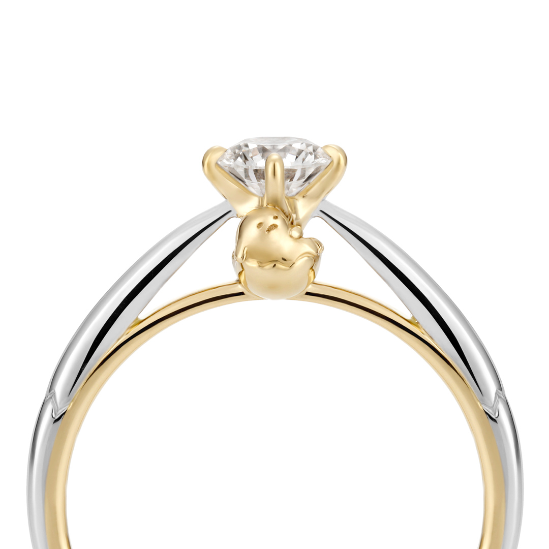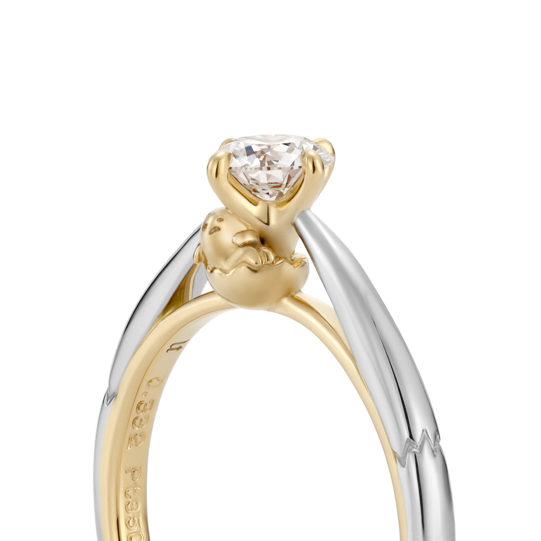 2色の金属で、ゆでたまごをイメージしたデザイン。 石座に、大切なダイヤモンドを見守るように“ぐでたま”をあしらいました。 大好きな“ぐでたま”を、いつでもそばに感じられそう…。