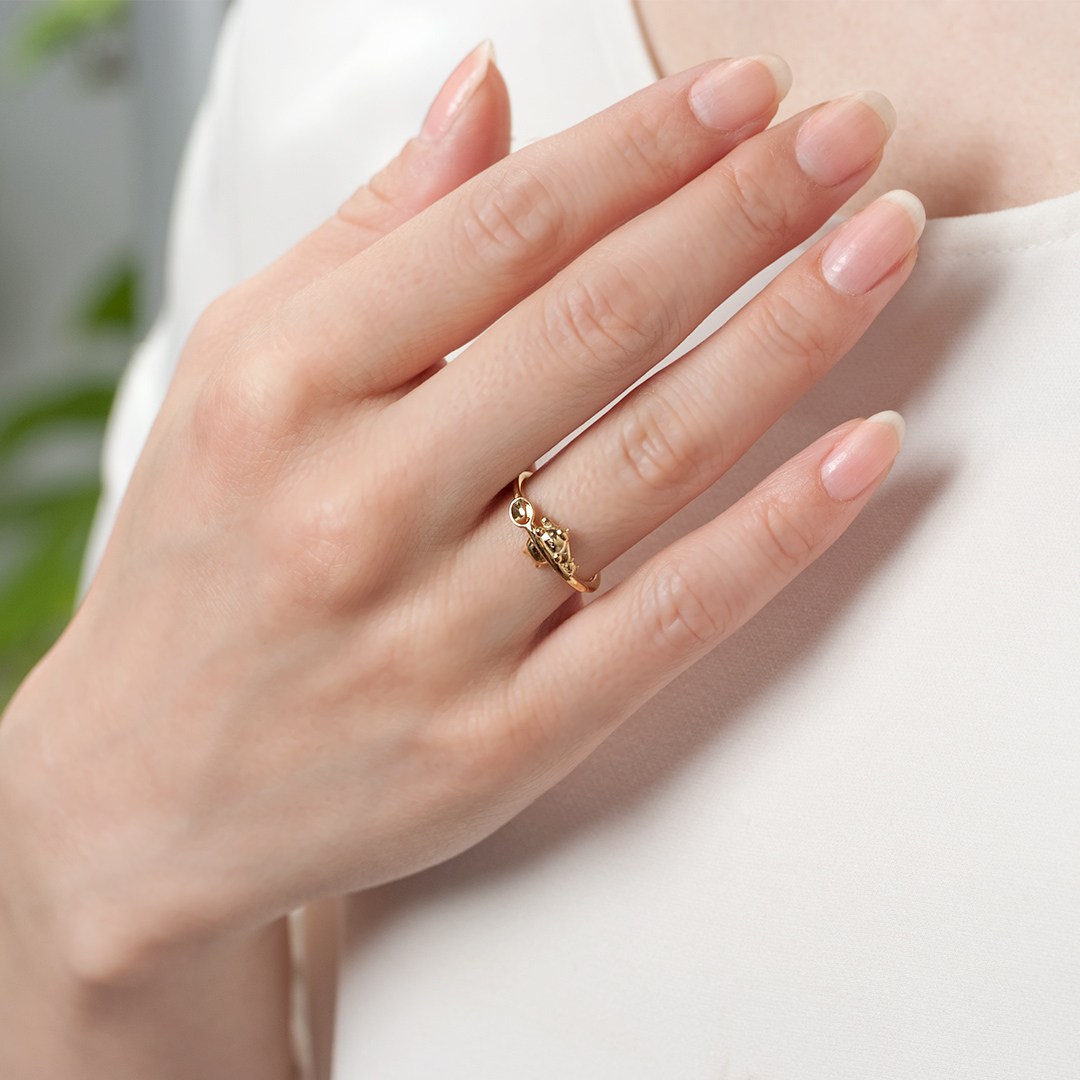 おおきなスプーンにぶらさがるポムポムプリンとマフィン。ママが作るおおきなプリンを待っているのかな?プリンを食べたら一緒におでかけ!コロンとしたフォルムや愛らしい表情など、細かなところまで繊細にデザインされたリング。リングの表側はぷっくりとした立体的な作り。内側は指あたりが良くなるよう、フラットな作りになっています。