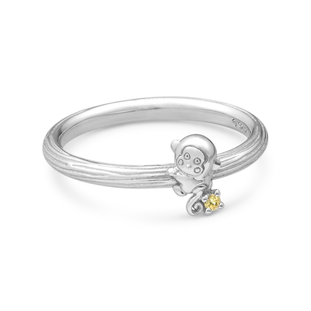 もんきちが木につかまって、こちらを見つめているデザインのリング。