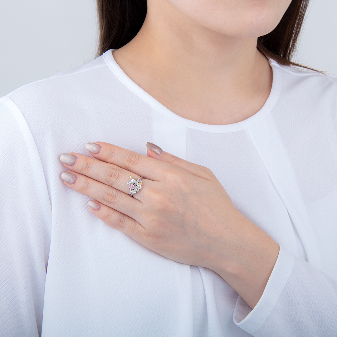 メルちゃんとハートやお花をカラーストーンを留めてカラフルに表現したリング。お花畑の中のメルちゃんのように、可愛く、夢の中にいるような、癒しに包まれて……。