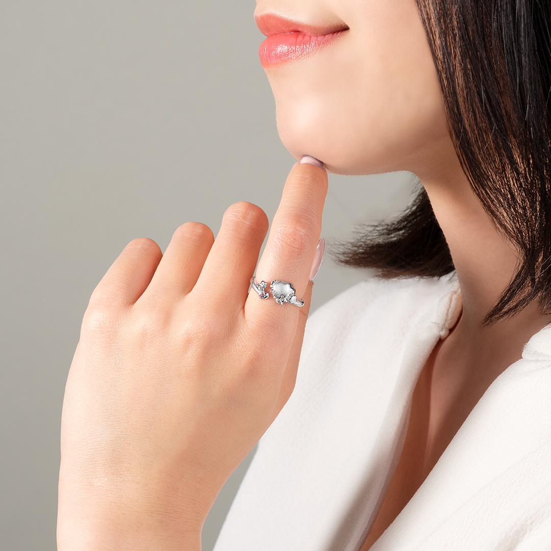 こぎみゅんとエビちゃんがお話している様子をデザインしたリング。ふたりの仲良しな様子に癒されます。