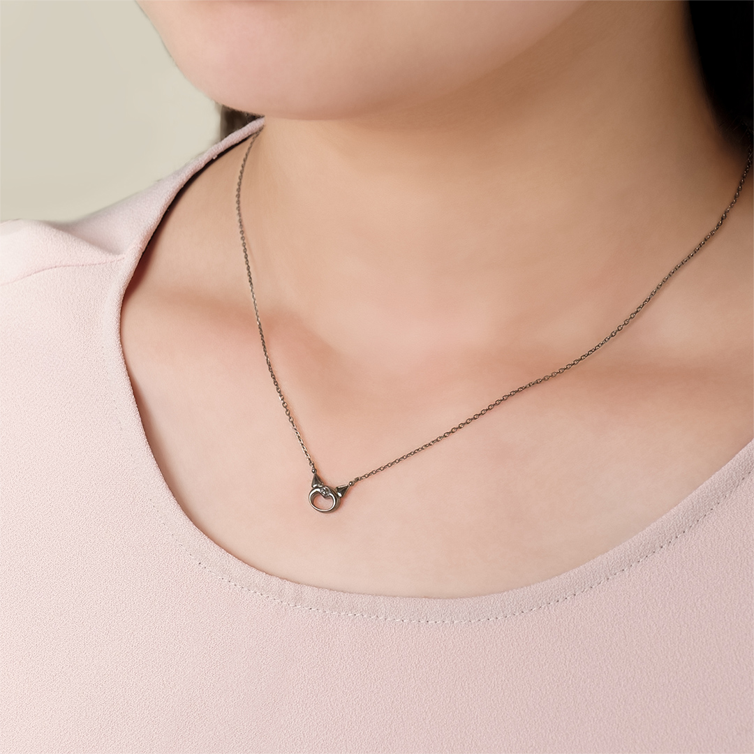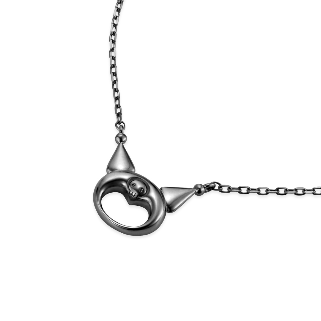 大好評のクロミネックレスにクロミお気に入りのブラックカラーが登場! クロミのシルエットがデザインされたネックレス。 額には、チャームポイントのどくろのモチーフが。甘すぎないデザインで、チャーミングなクロミを表現しています。 お揃いのリングもご用意しています。