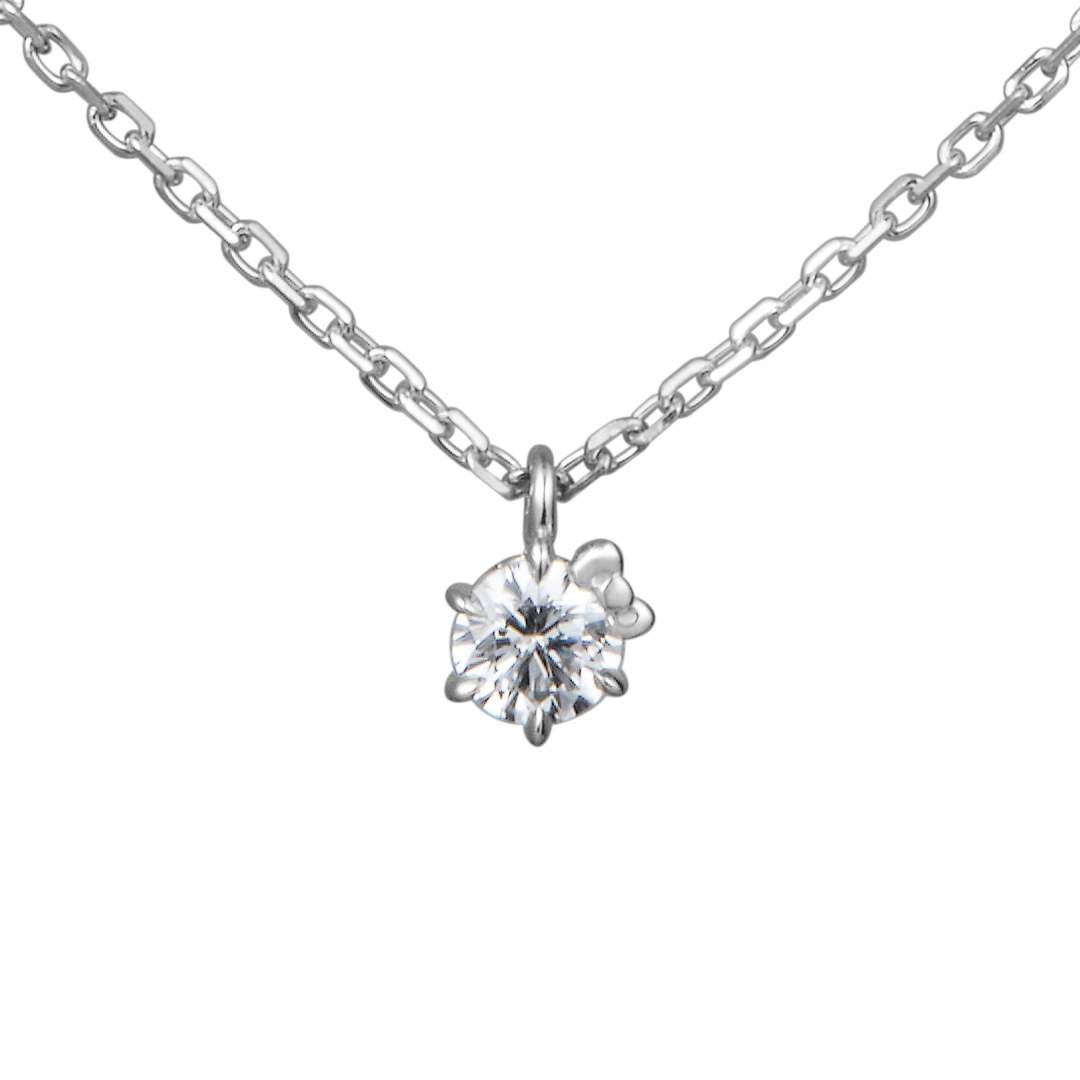 シンプルな透明石のネックレスにハローキティのリボンをデザイン。世界中から愛されるハローキティのように、キラキラとまぶしく輝き続けることを願って。